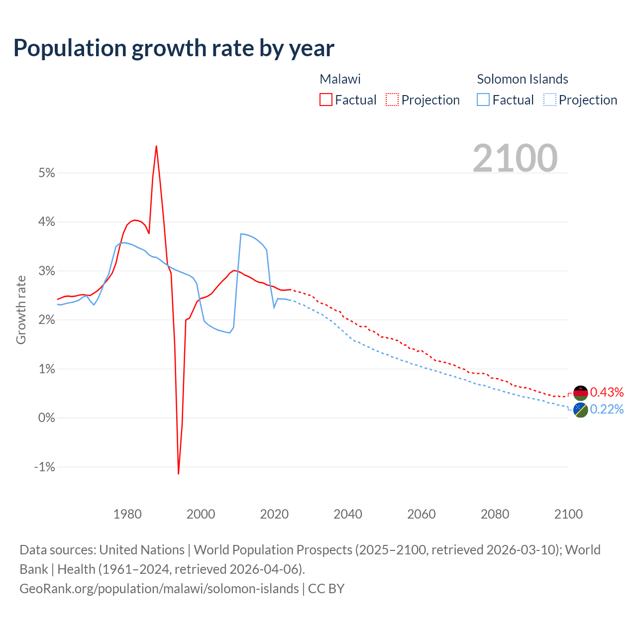- For the last 10 years, Malawi has had an average growth rate of +2.7% per year vs +2.95% in the Solomon Islands.