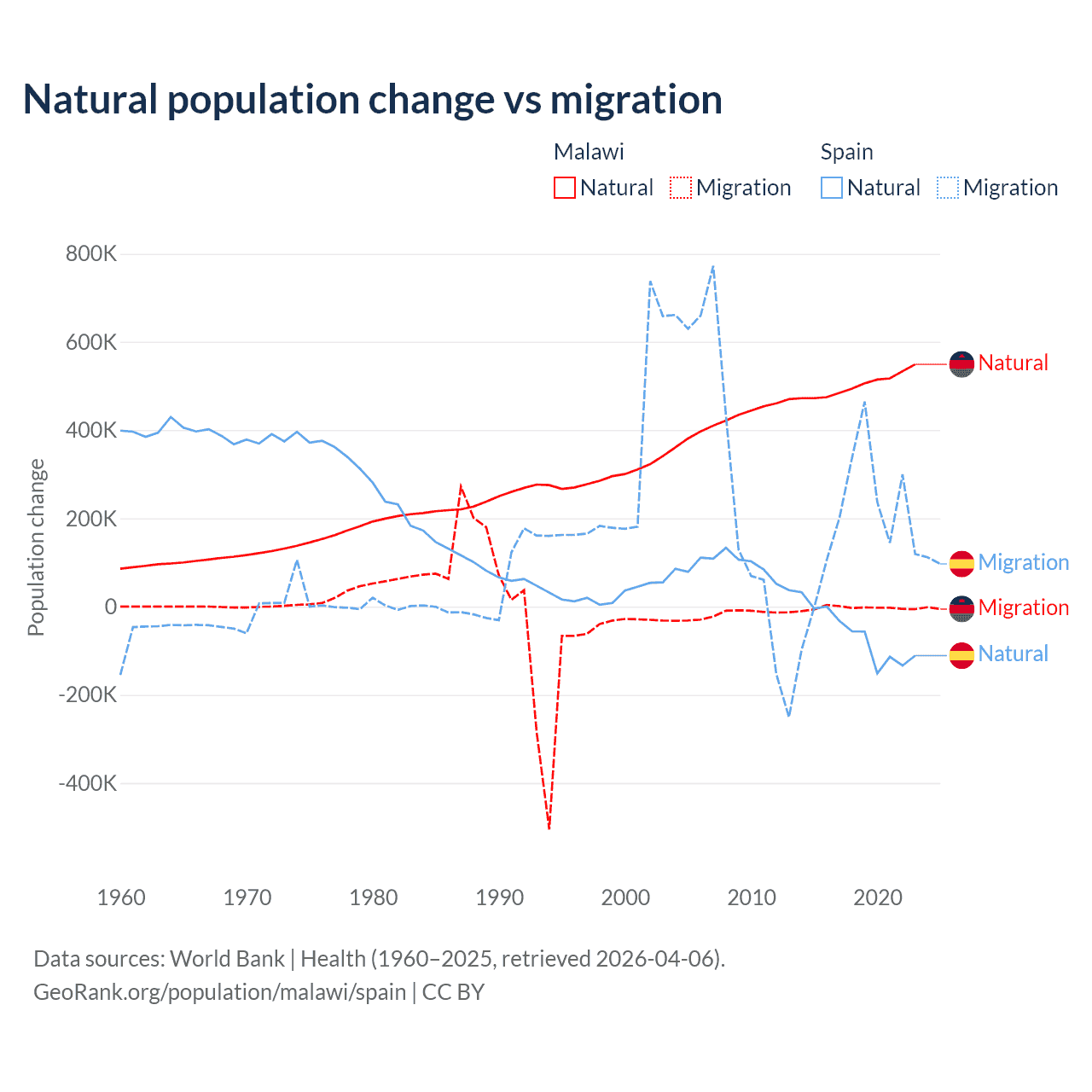 Over the last 10 years, 99.3% of the population change in Malawi is from natural causes (a gain of 5,019,393 people) and 0.67% is from migration (a loss of 33,768 people). In Spain 25.8% is from natural causes (a loss of 627,829 people) and 74.2% is from migration (a gain of 1,810,127 people).