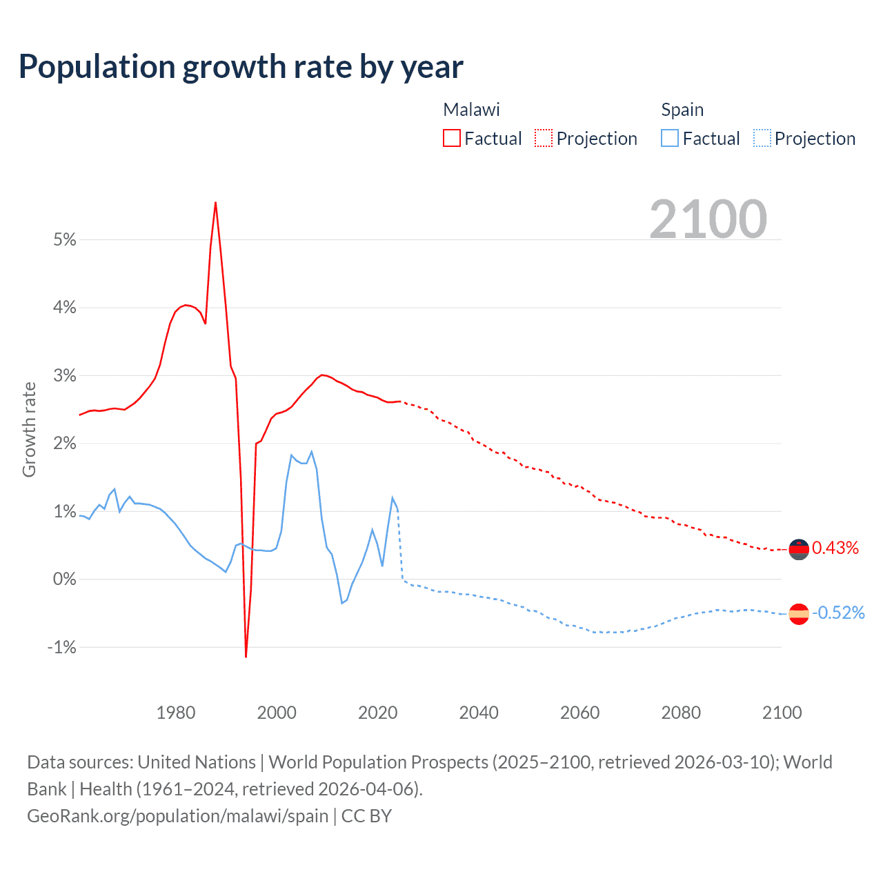 - For the last 10 years, Malawi has had an average growth rate of +2.7% per year vs +0.43% in Spain.