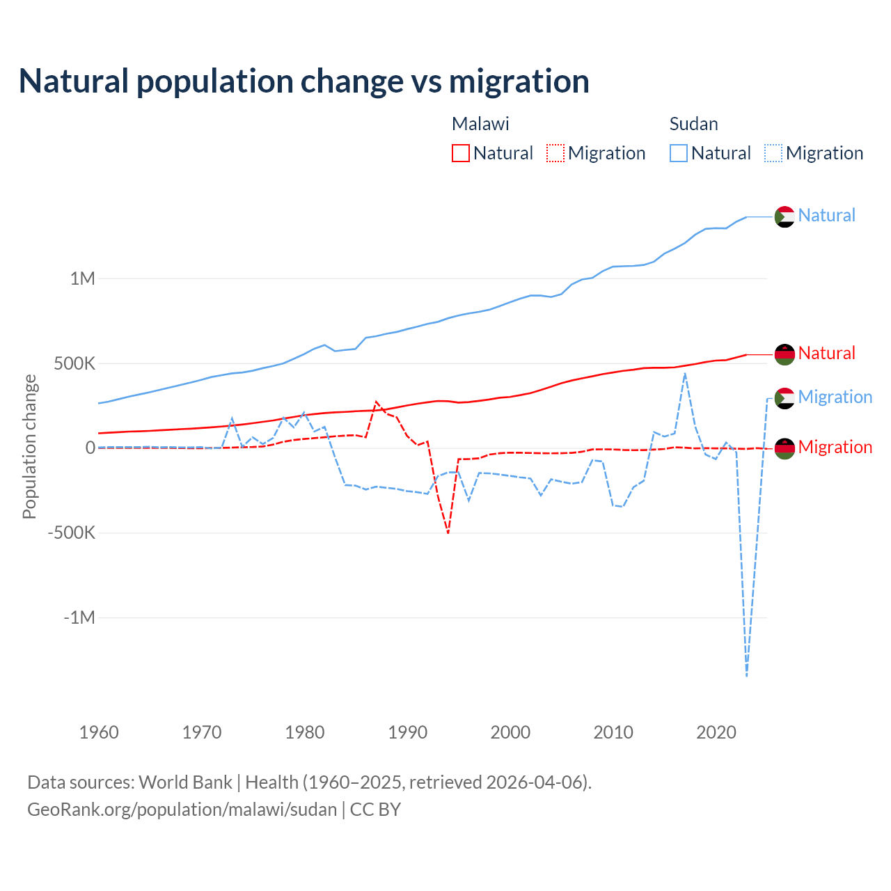 Over the last 10 years, 99.3% of the population change in Malawi is from natural causes (a gain of 5,019,393 people) and 0.67% is from migration (a loss of 33,768 people). In Sudan 95.1% is from natural causes (a gain of 12,459,977 people) and 4.88% is from migration (a loss of 639,596 people).