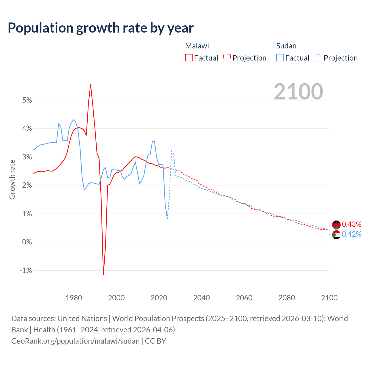 - For the last 10 years, Malawi has had an average growth rate of +2.7% per year vs +2.67% in Sudan.