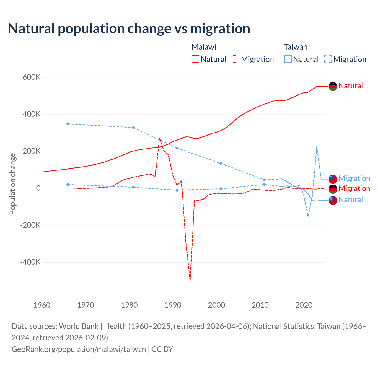 Over the last 10 years, 99.3% of the population change in Malawi is from natural causes (a gain of 5,019,393 people) and 0.67% is from migration (a loss of 33,768 people). In Taiwan 56.7% is from natural causes (a loss of 57,467 people) and 43.3% is from migration (a gain of 43,884 people).