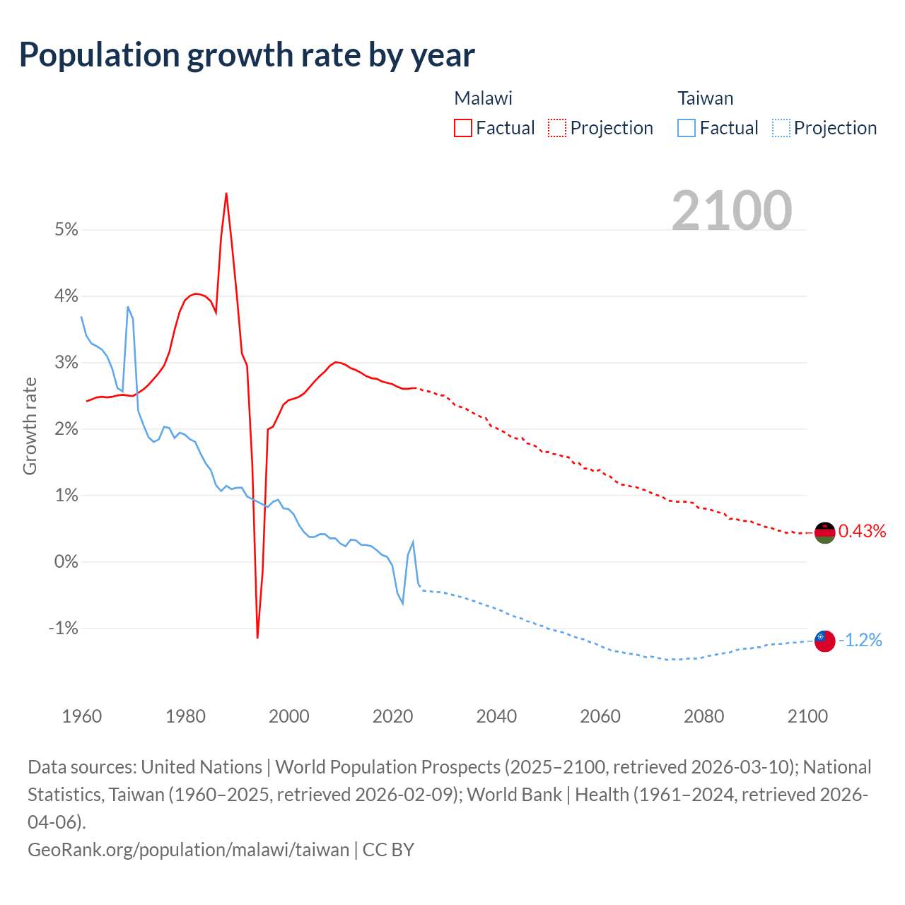 - For the last 10 years, Malawi has had an average growth rate of +2.7% per year vs -0.03% in Taiwan.