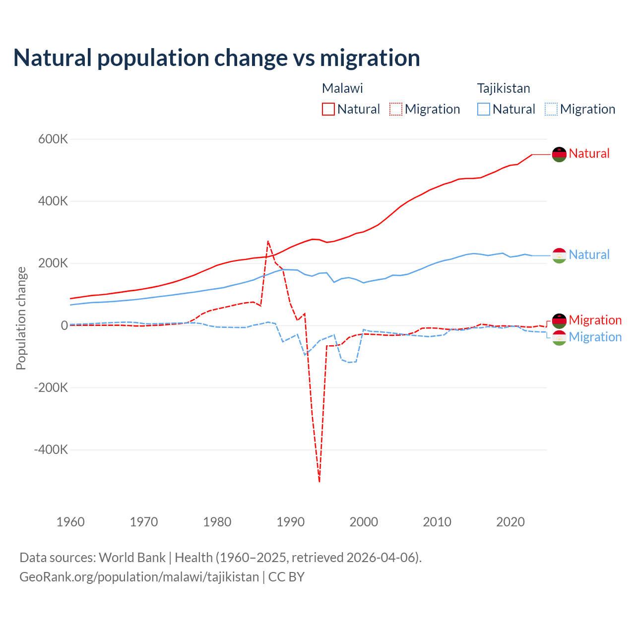 Over the last 10 years, 99.3% of the population change in Malawi is from natural causes (a gain of 5,019,393 people) and 0.67% is from migration (a loss of 33,768 people). In Tajikistan 96% is from natural causes (a gain of 2,266,045 people) and 3.95% is from migration (a loss of 93,205 people).