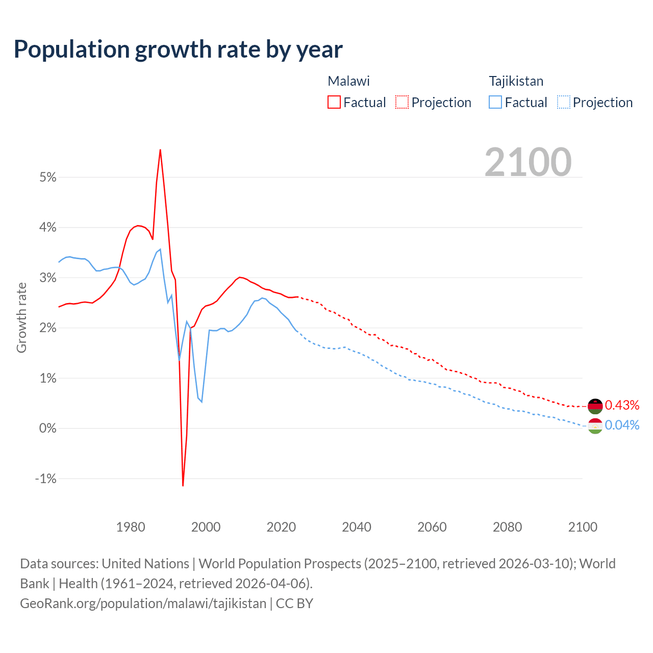 - For the last 10 years, Malawi has had an average growth rate of +2.7% per year vs +2.33% in Tajikistan.