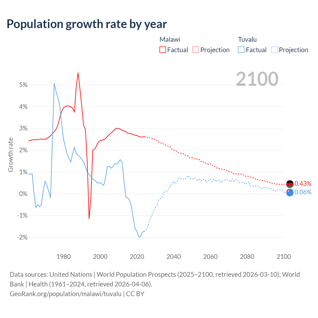 - For the last 10 years, Malawi has had an average growth rate of +2.7% per year vs -1.19% in Tuvalu.