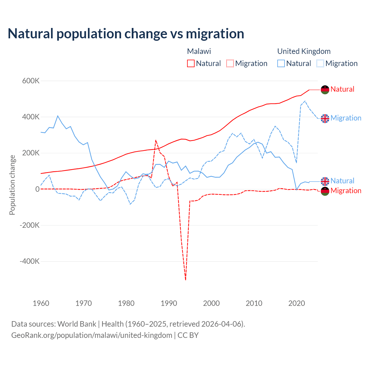 Over the last 10 years, 99.3% of the population change in Malawi is from natural causes (a gain of 5,019,393 people) and 0.67% is from migration (a loss of 33,768 people). In the United Kingdom 23.9% is from natural causes (a gain of 1,033,129 people) and 76.1% is from migration (a gain of 3,283,101 people).