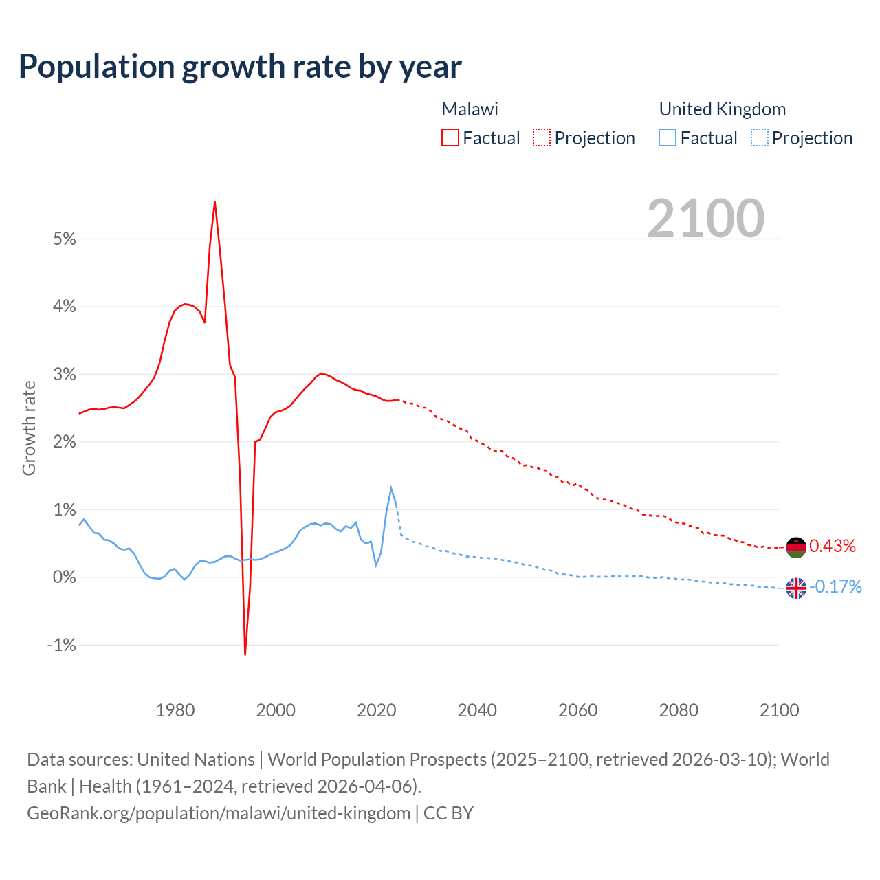 - For the last 10 years, Malawi has had an average growth rate of +2.7% per year vs +0.7% in the United Kingdom.