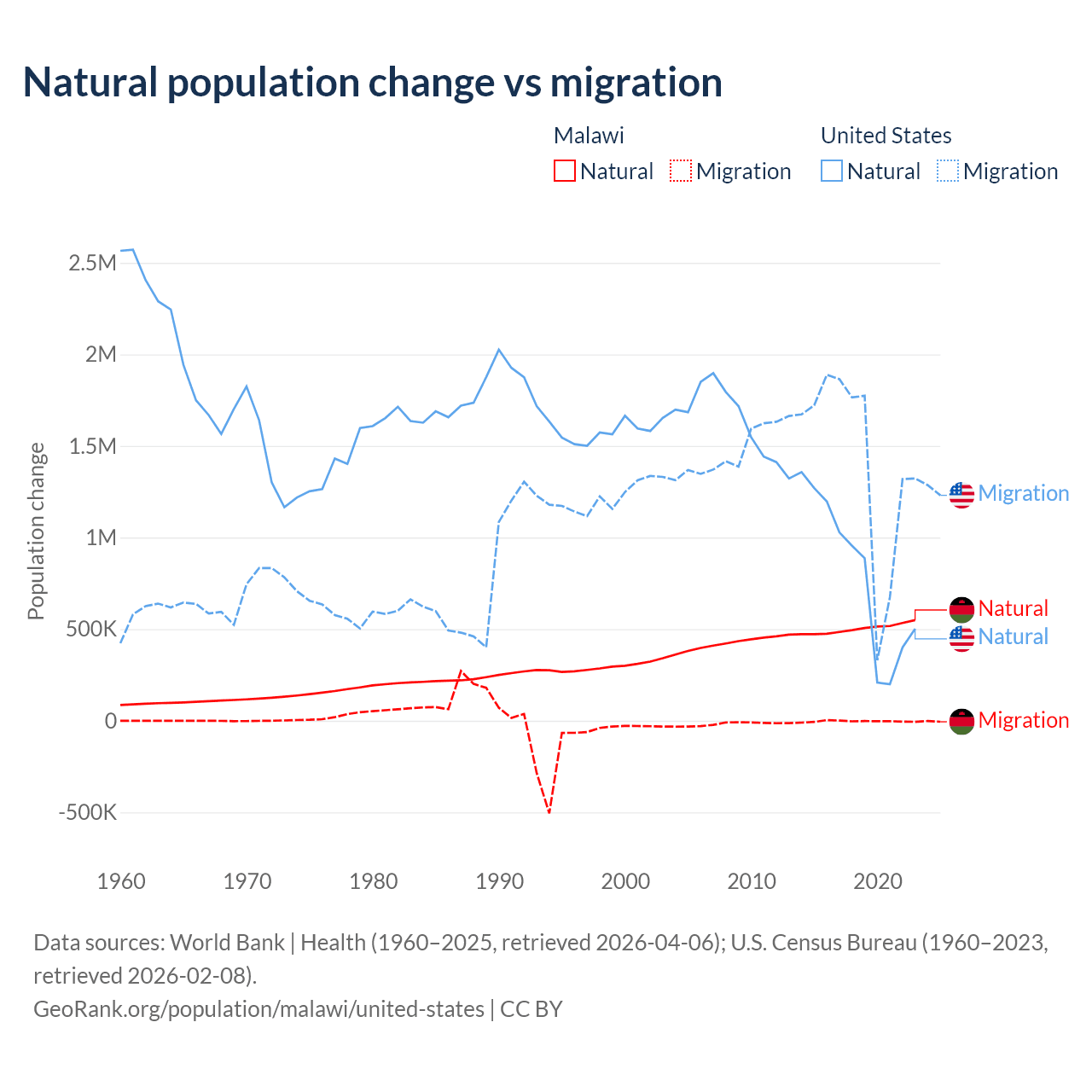 Over the last 10 years, 99.3% of the population change in Malawi is from natural causes (a gain of 5,019,393 people) and 0.67% is from migration (a loss of 33,768 people). In the United States 35.8% is from natural causes (a gain of 8,005,866 people) and 64.2% is from migration (a gain of 14,334,286 people).