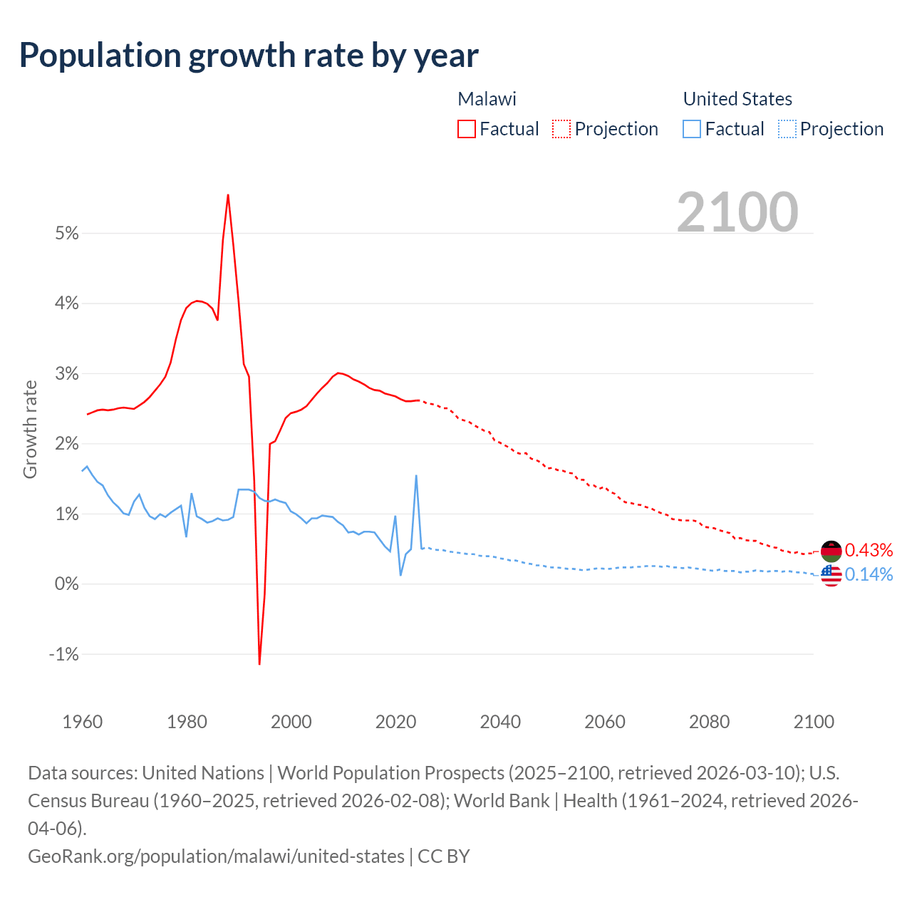 Data sources: World Bank | Health (1960–2024, retrieved 2026-04-06); United Nations | World Population Prospects (1960–2026, retrieved 2026-03-10); U.S. Census Bureau (1960–2025, retrieved 2026-02-08); Central Intelligence Agency (CIA) (2000–2019, retrieved 2026-02-20).