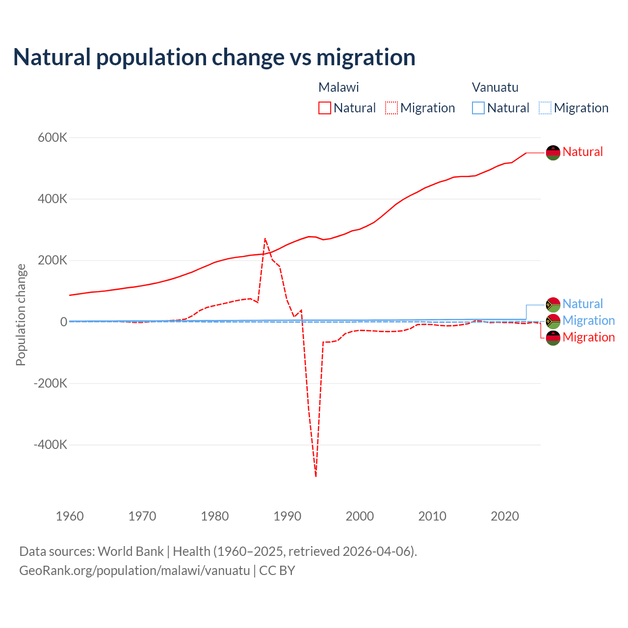 Over the last 10 years, 99.3% of the population change in Malawi is from natural causes (a gain of 5,019,393 people) and 0.67% is from migration (a loss of 33,768 people). In Vanuatu 92.2% is from natural causes (a gain of 72,941 people) and 7.81% is from migration (a loss of 6,181 people).