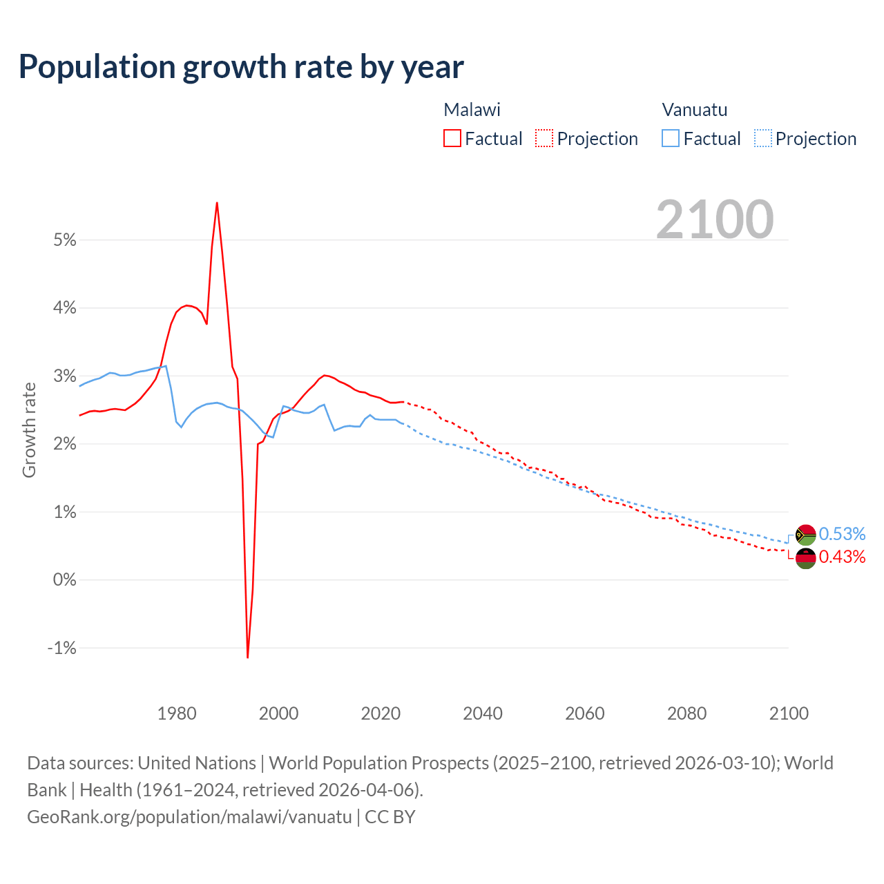 - For the last 10 years, Malawi has had an average growth rate of +2.7% per year vs +2.33% in Vanuatu.