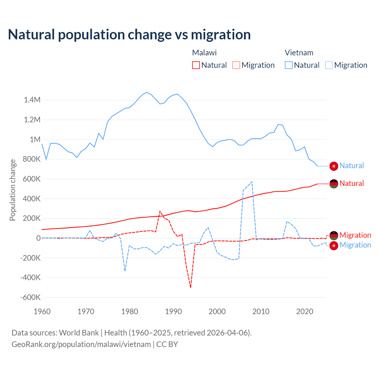 Over the last 10 years, 99.3% of the population change in Malawi is from natural causes (a gain of 5,019,393 people) and 0.67% is from migration (a loss of 33,768 people). In Vietnam 97.7% is from natural causes (a gain of 9,349,756 people) and 2.29% is from migration (a gain of 219,073 people).