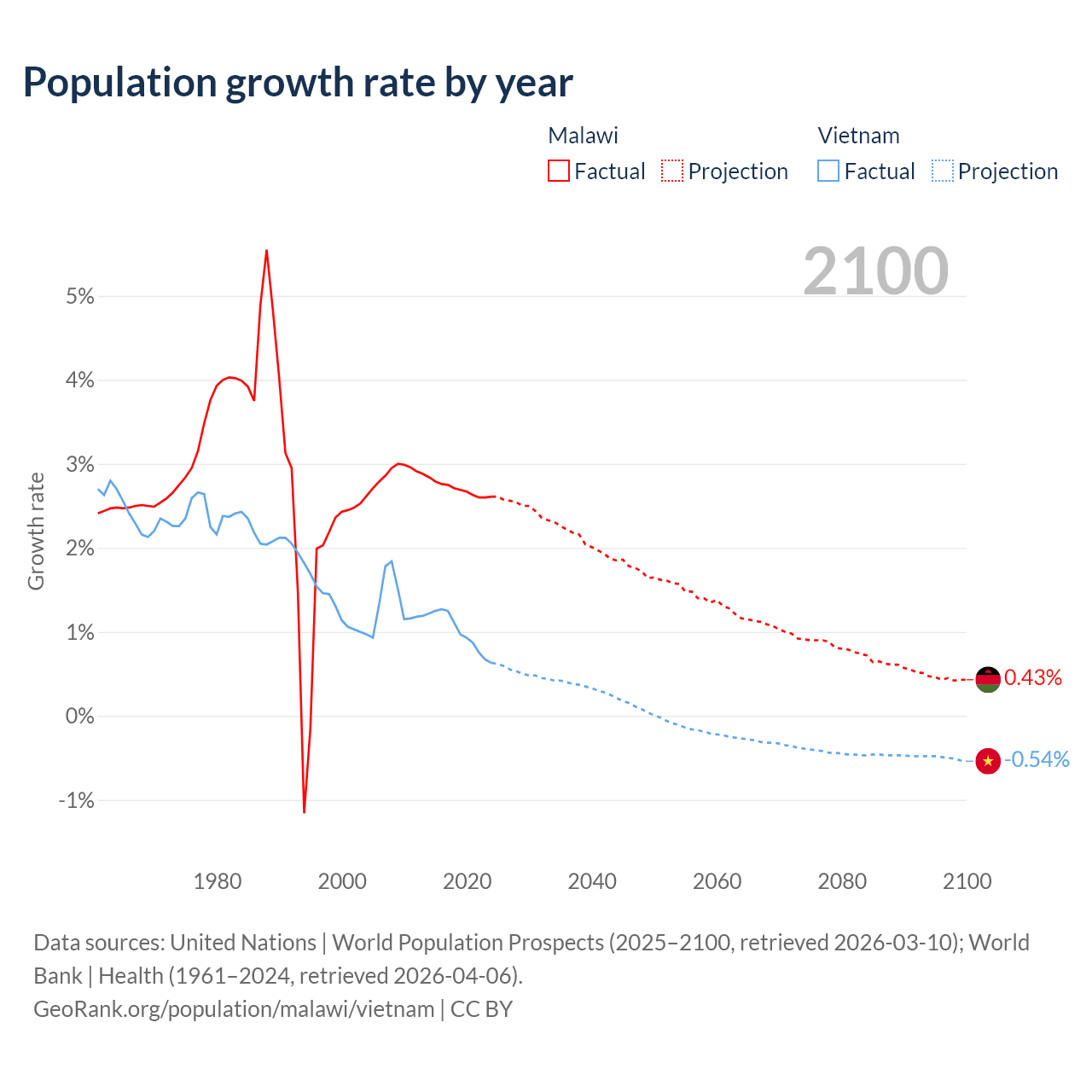 - For the last 10 years, Malawi has had an average growth rate of +2.7% per year vs +0.99% in Vietnam.