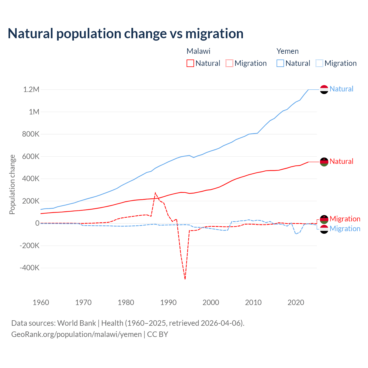 Over the last 10 years, 99.3% of the population change in Malawi is from natural causes (a gain of 5,019,393 people) and 0.67% is from migration (a loss of 33,768 people). In Yemen 97.8% is from natural causes (a gain of 10,460,813 people) and 2.17% is from migration (a loss of 231,814 people).