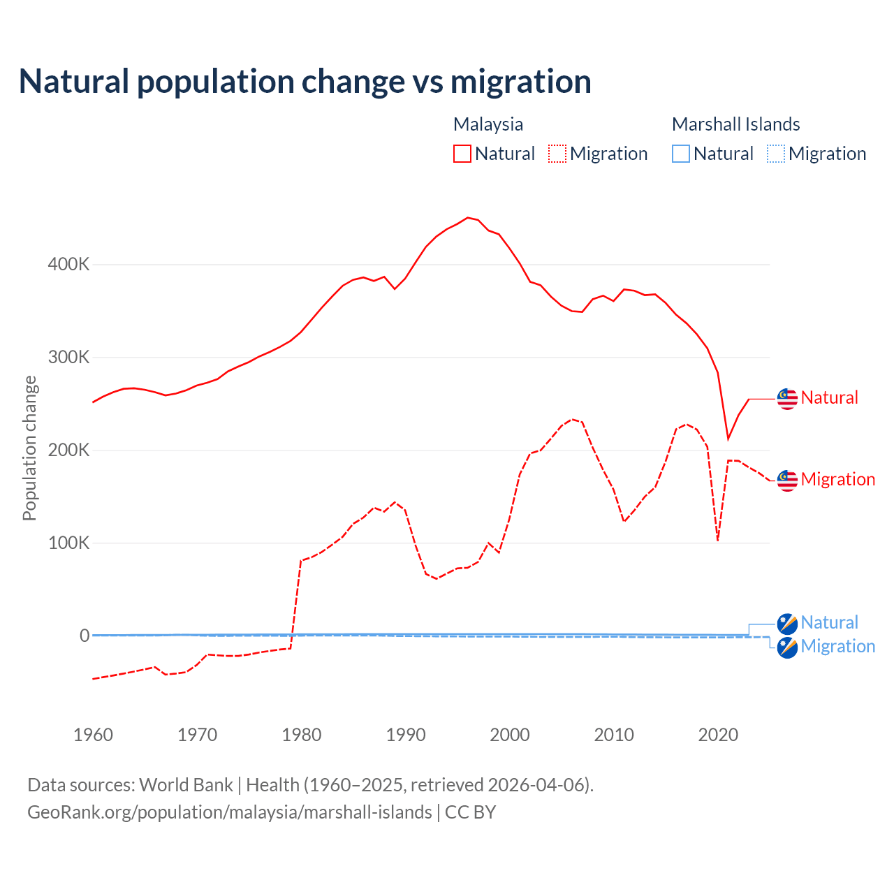 Over the last 10 years, 61.7% of the population change in Malaysia is from natural causes (a gain of 3,029,648 people) and 38.3% is from migration (a gain of 1,882,159 people). In the Marshall Islands 27.8% is from natural causes (a gain of 7,592 people) and 72.2% is from migration (a loss of 19,682 people).