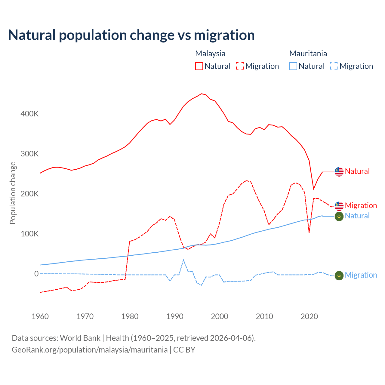 Over the last 10 years, 61.7% of the population change in Malaysia is from natural causes (a gain of 3,029,648 people) and 38.3% is from migration (a gain of 1,882,159 people). In Mauritania 98.9% is from natural causes (a gain of 1,320,903 people) and 1.12% is from migration (a loss of 14,982 people).