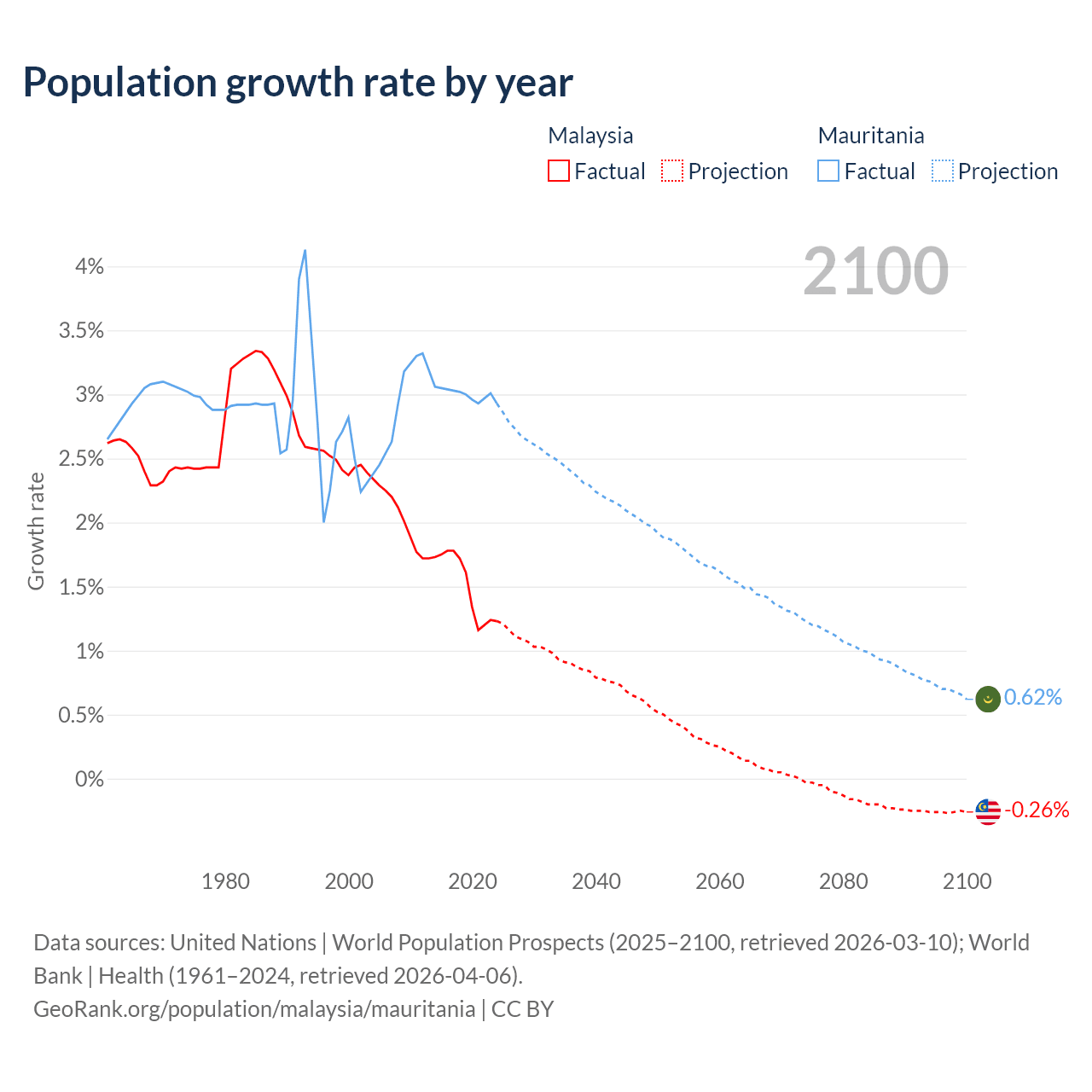 - For the last 10 years, Malaysia has had an average growth rate of +1.5% per year vs +3% in Mauritania.