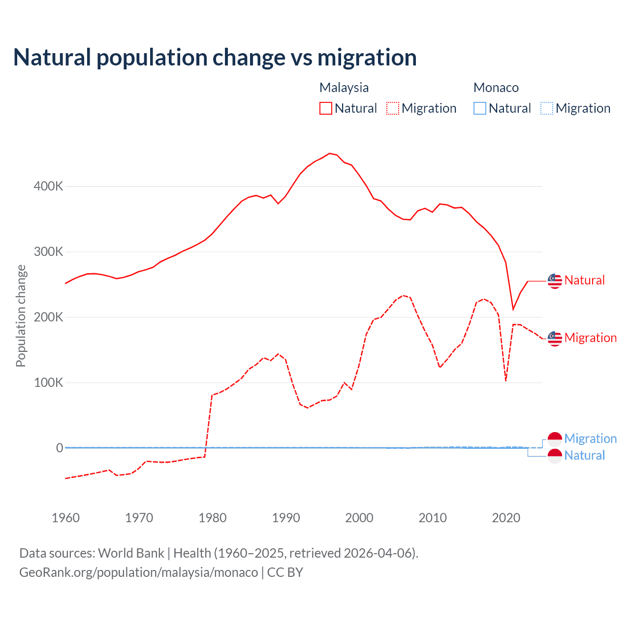 Over the last 10 years, 61.7% of the population change in Malaysia is from natural causes (a gain of 3,029,648 people) and 38.3% is from migration (a gain of 1,882,159 people). In Monaco 37.3% is from natural causes (a loss of 4,357 people) and 62.7% is from migration (a gain of 7,333 people).