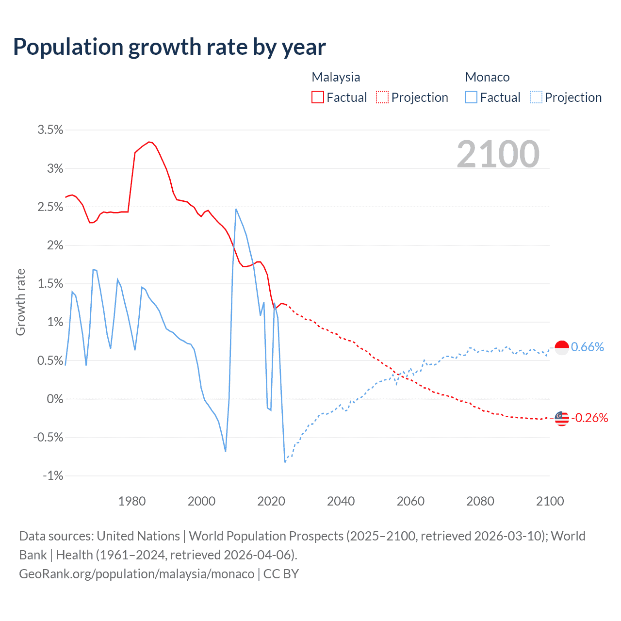- For the last 10 years, Malaysia has had an average growth rate of +1.5% per year vs +0.79% in Monaco.