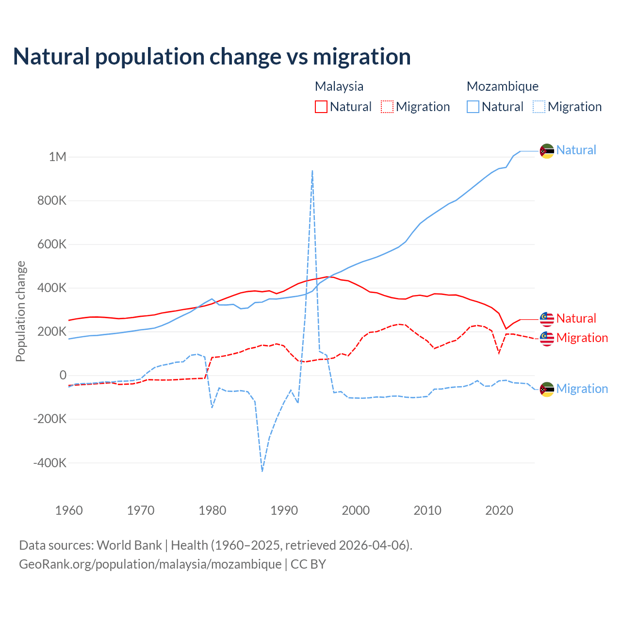 Over the last 10 years, 61.7% of the population change in Malaysia is from natural causes (a gain of 3,029,648 people) and 38.3% is from migration (a gain of 1,882,159 people). In Mozambique 95.9% is from natural causes (a gain of 9,108,203 people) and 4.15% is from migration (a loss of 393,923 people).