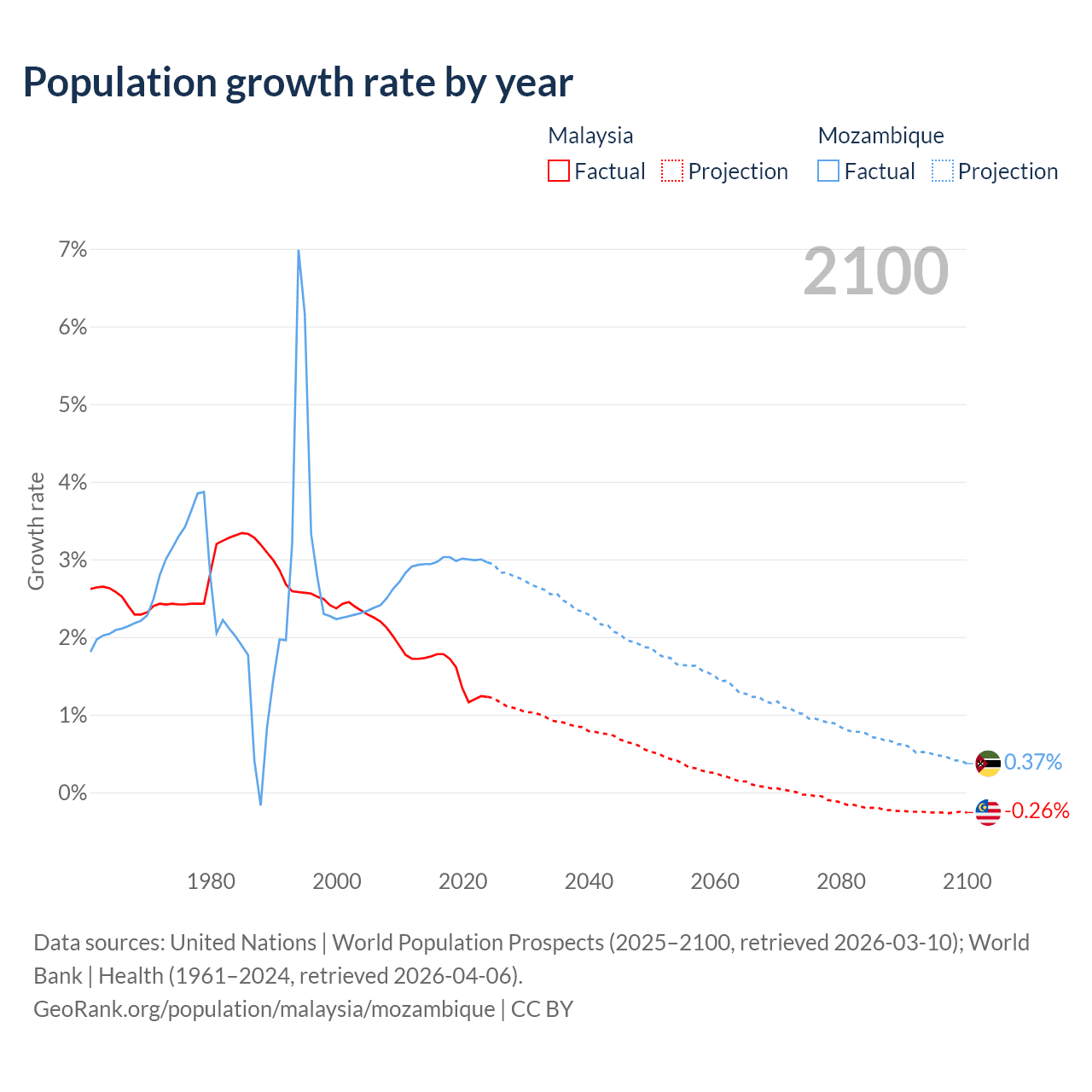 - For the last 10 years, Malaysia has had an average growth rate of +1.5% per year vs +2.99% in Mozambique.