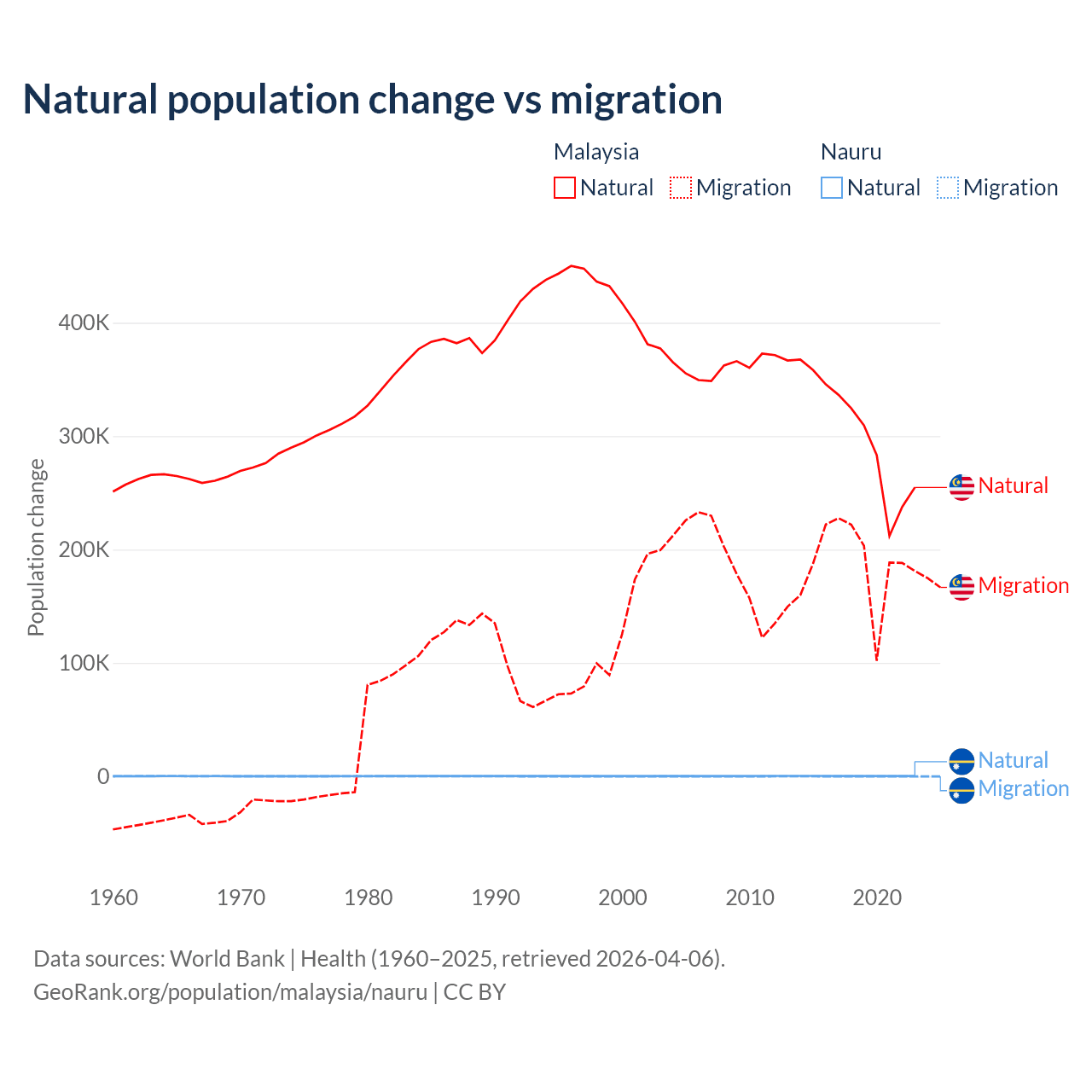 Over the last 10 years, 61.7% of the population change in Malaysia is from natural causes (a gain of 3,029,648 people) and 38.3% is from migration (a gain of 1,882,159 people). In Nauru 66.2% is from natural causes (a gain of 2,590 people) and 33.8% is from migration (a loss of 1,320 people).