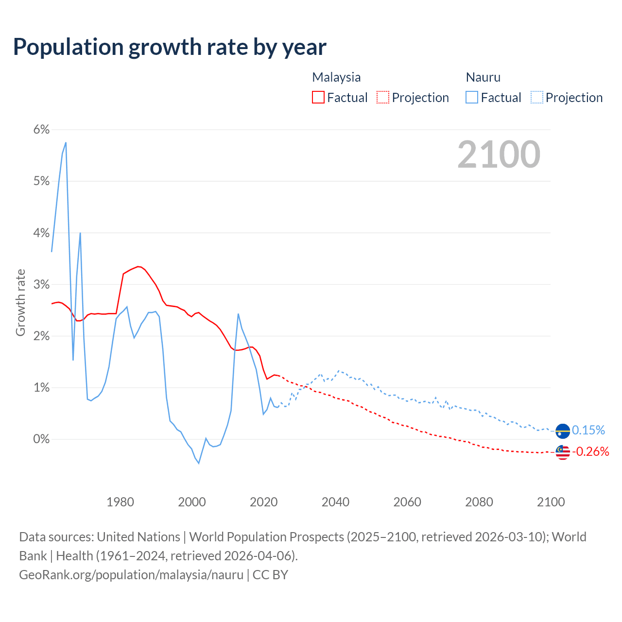 - For the last 10 years, Malaysia has had an average growth rate of +1.5% per year vs +1.17% in Nauru.