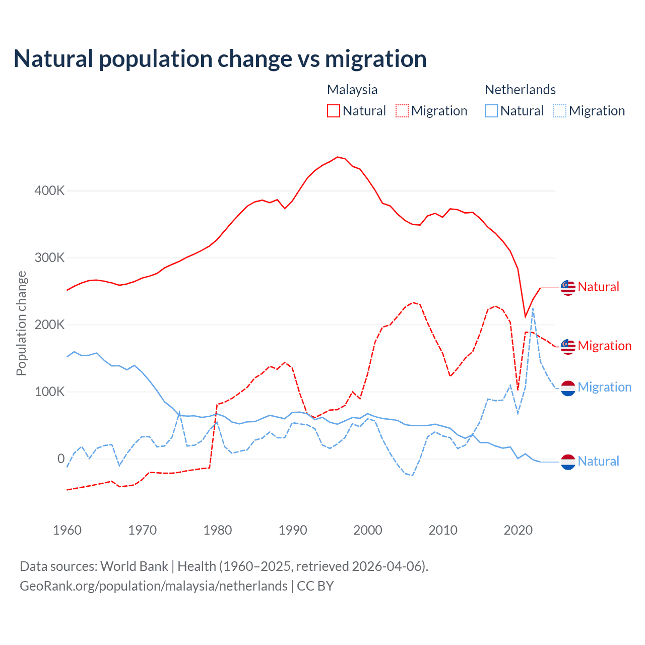 Over the last 10 years, 61.7% of the population change in Malaysia is from natural causes (a gain of 3,029,648 people) and 38.3% is from migration (a gain of 1,882,159 people). In the Netherlands 11.8% is from natural causes (a gain of 134,554 people) and 88.2% is from migration (a gain of 1,006,495 people).