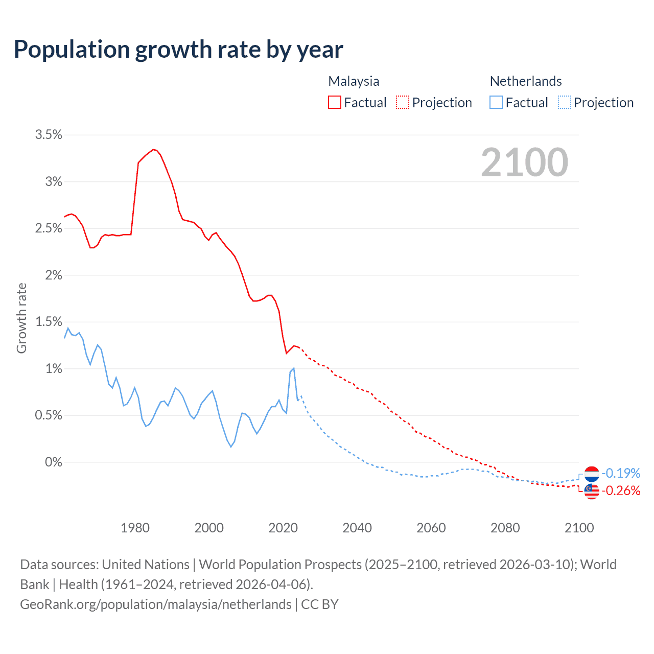 - For the last 10 years, Malaysia has had an average growth rate of +1.5% per year vs +0.62% in the Netherlands.