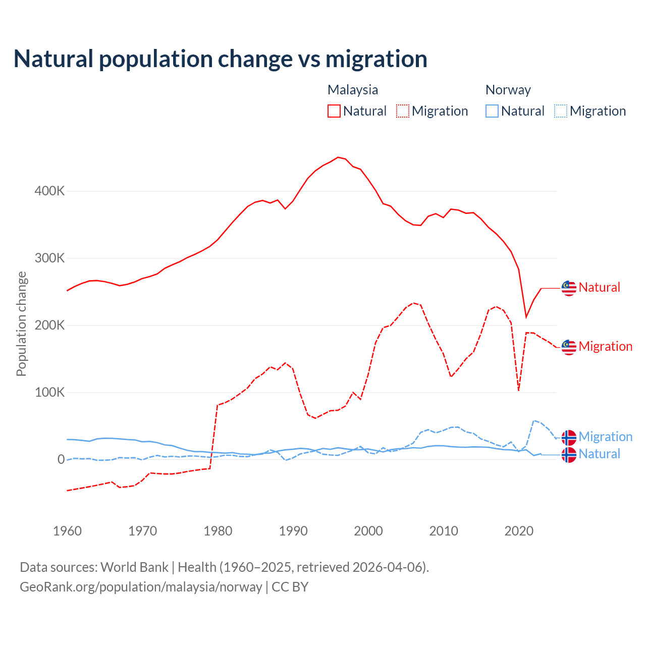 Over the last 10 years, 61.7% of the population change in Malaysia is from natural causes (a gain of 3,029,648 people) and 38.3% is from migration (a gain of 1,882,159 people). In Norway 31.3% is from natural causes (a gain of 138,699 people) and 68.7% is from migration (a gain of 303,945 people).
