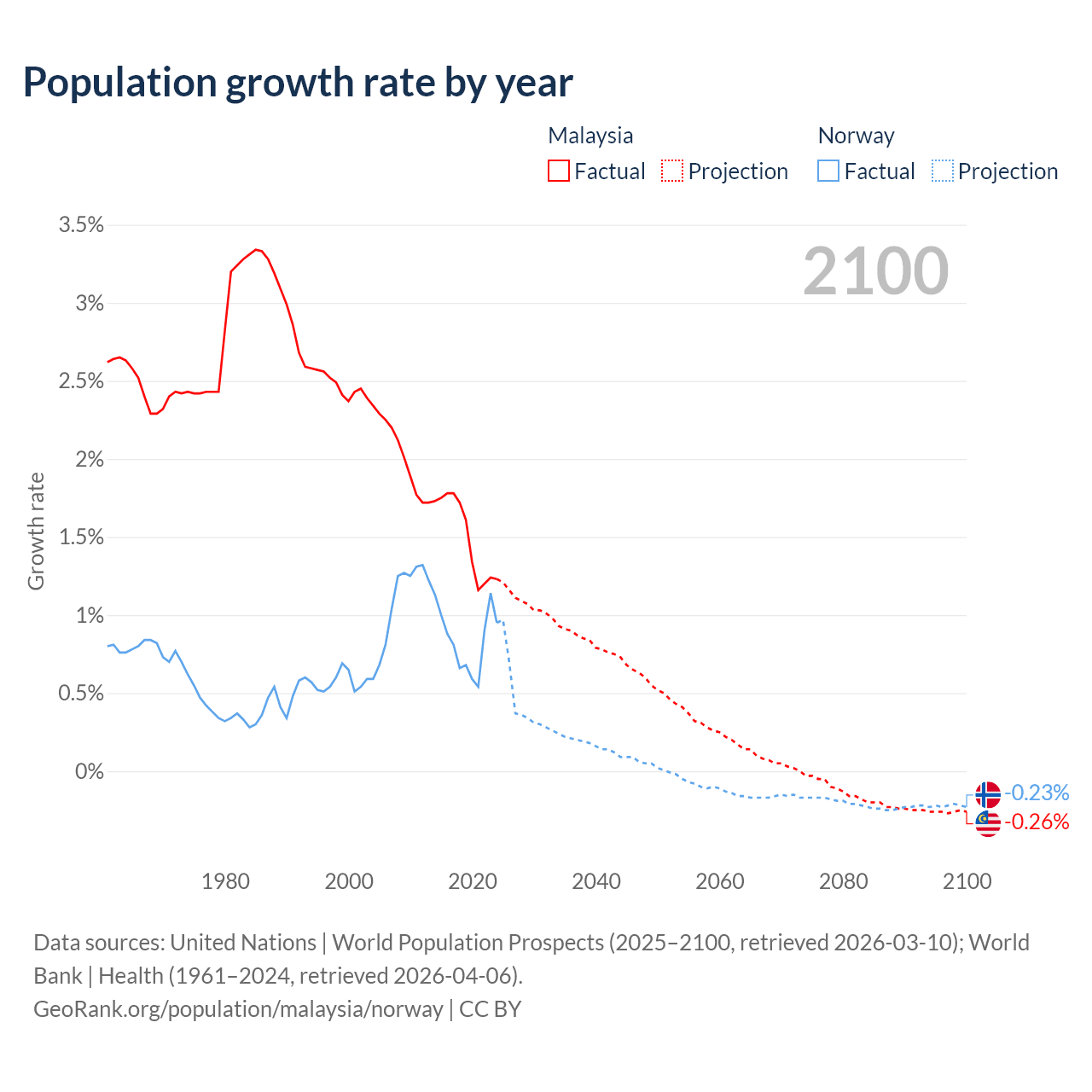 - For the last 10 years, Malaysia has had an average growth rate of +1.5% per year vs +0.85% in Norway.