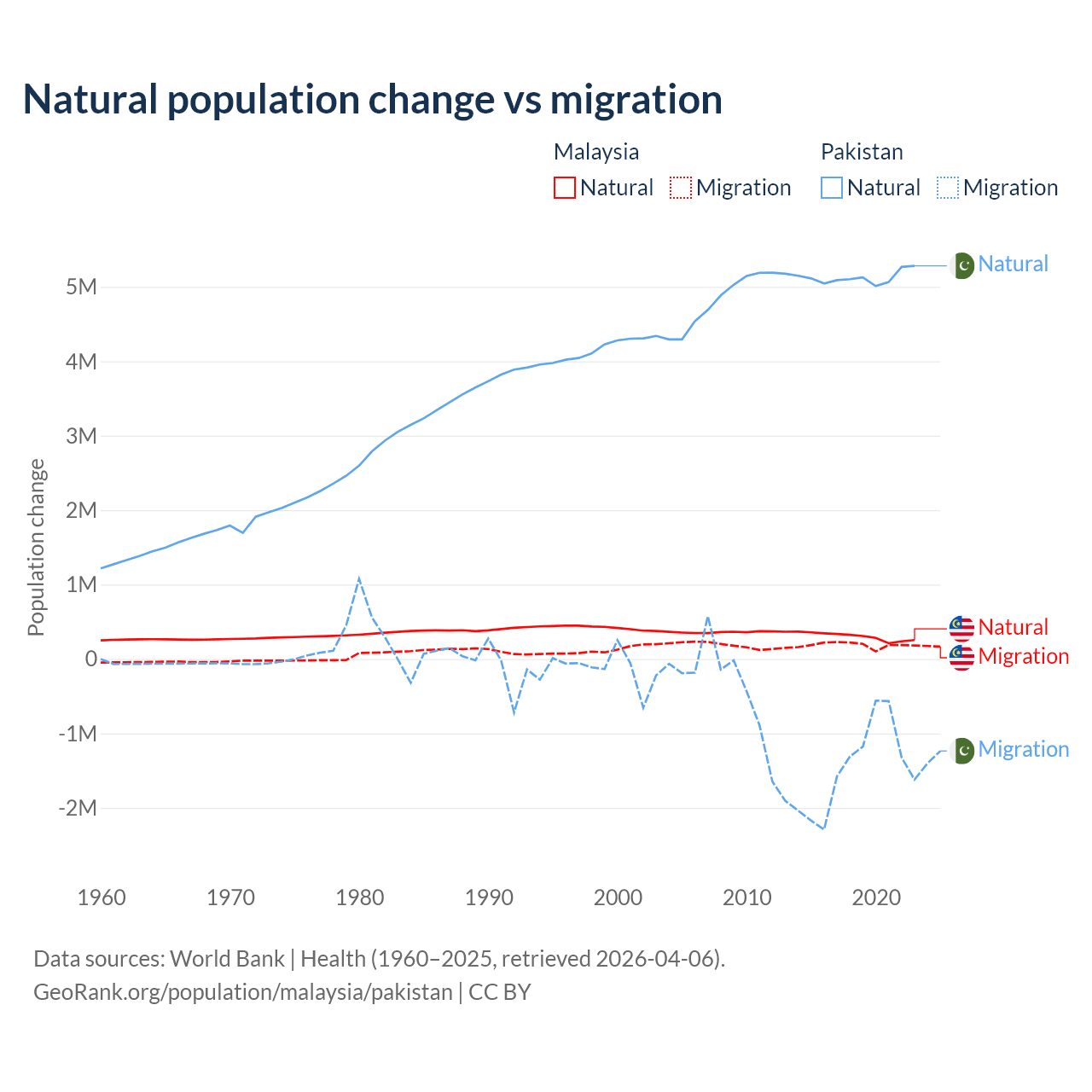 Over the last 10 years, 61.7% of the population change in Malaysia is from natural causes (a gain of 3,029,648 people) and 38.3% is from migration (a gain of 1,882,159 people). In Pakistan 77.8% is from natural causes (a gain of 51,255,404 people) and 22.2% is from migration (a loss of 14,629,055 people).