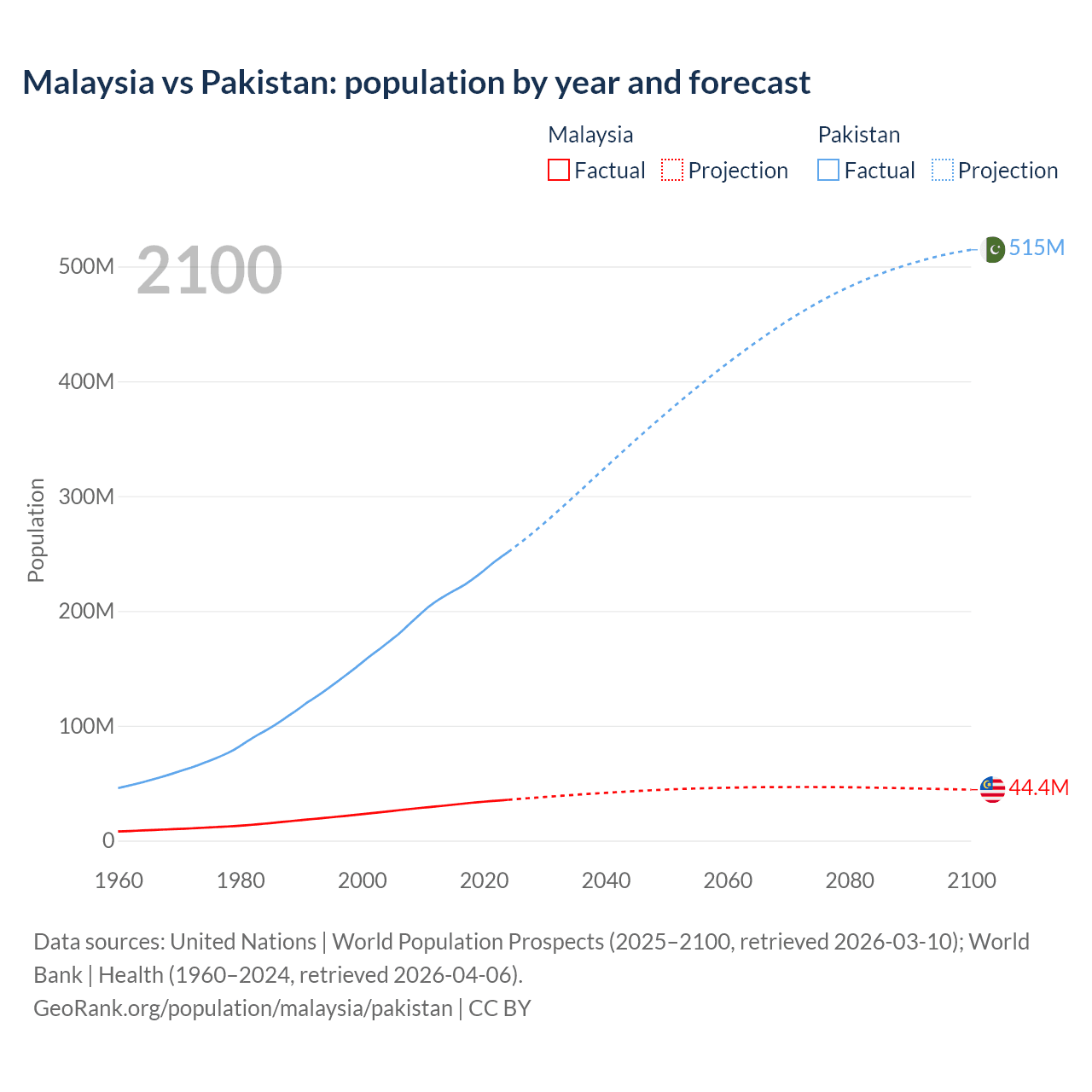 The latest officially reported population of Malaysia was 35,557,673 in 2024 vs 251,269,164 people in Pakistan in 2024. In 2026, based on the adjusted UN estimation, the current Malaysia's population is 36,512,221 people compared to 260,356,147 in Pakistan.