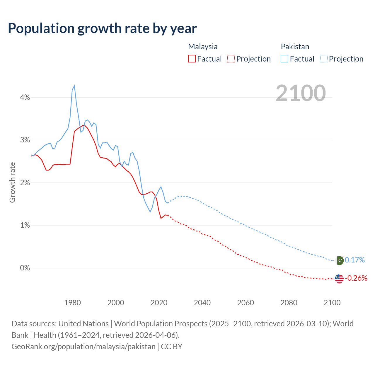 - For the last 10 years, Malaysia has had an average growth rate of +1.5% per year vs +1.6% in Pakistan.
