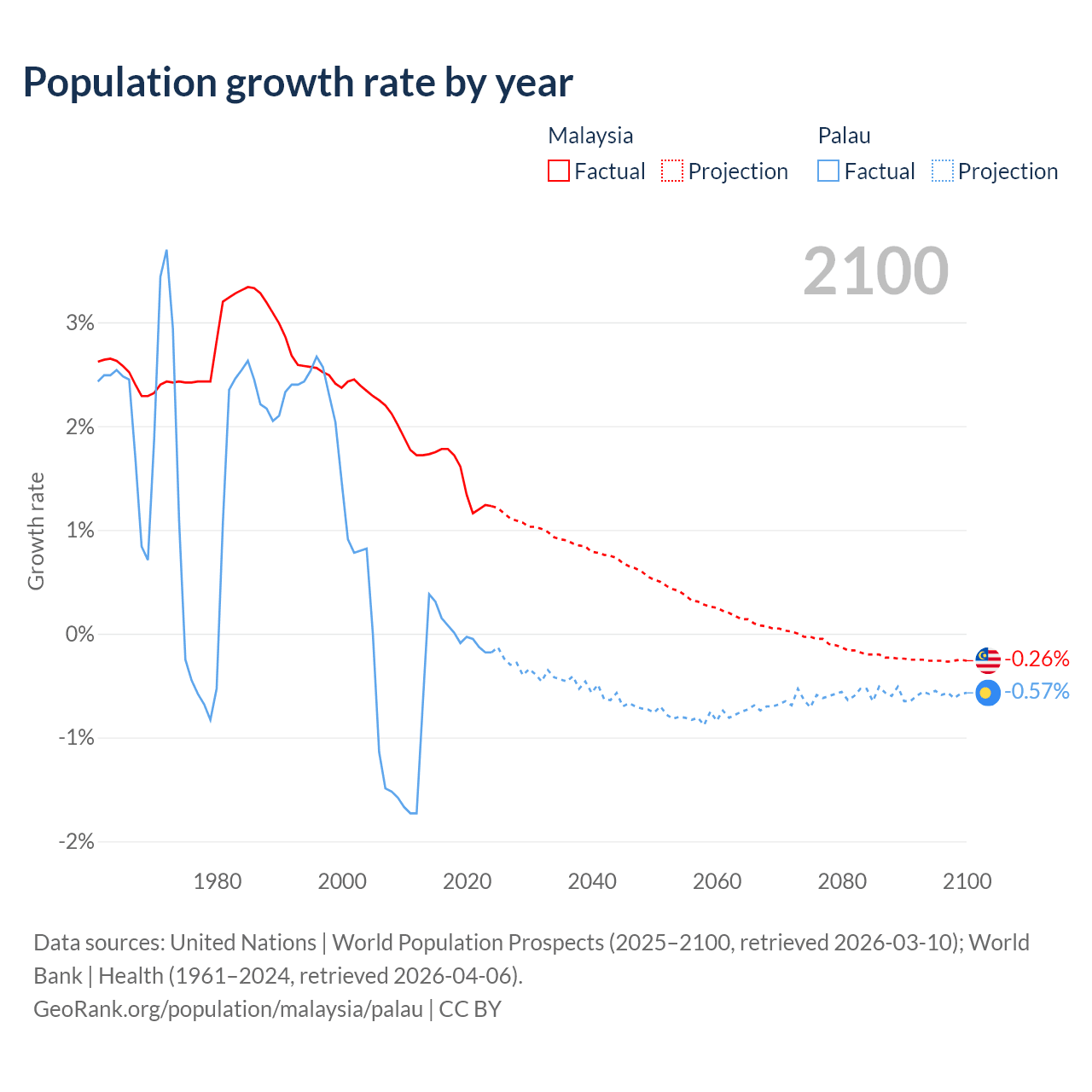 - For the last 10 years, Malaysia has had an average growth rate of +1.5% per year vs +0.02% in Palau.