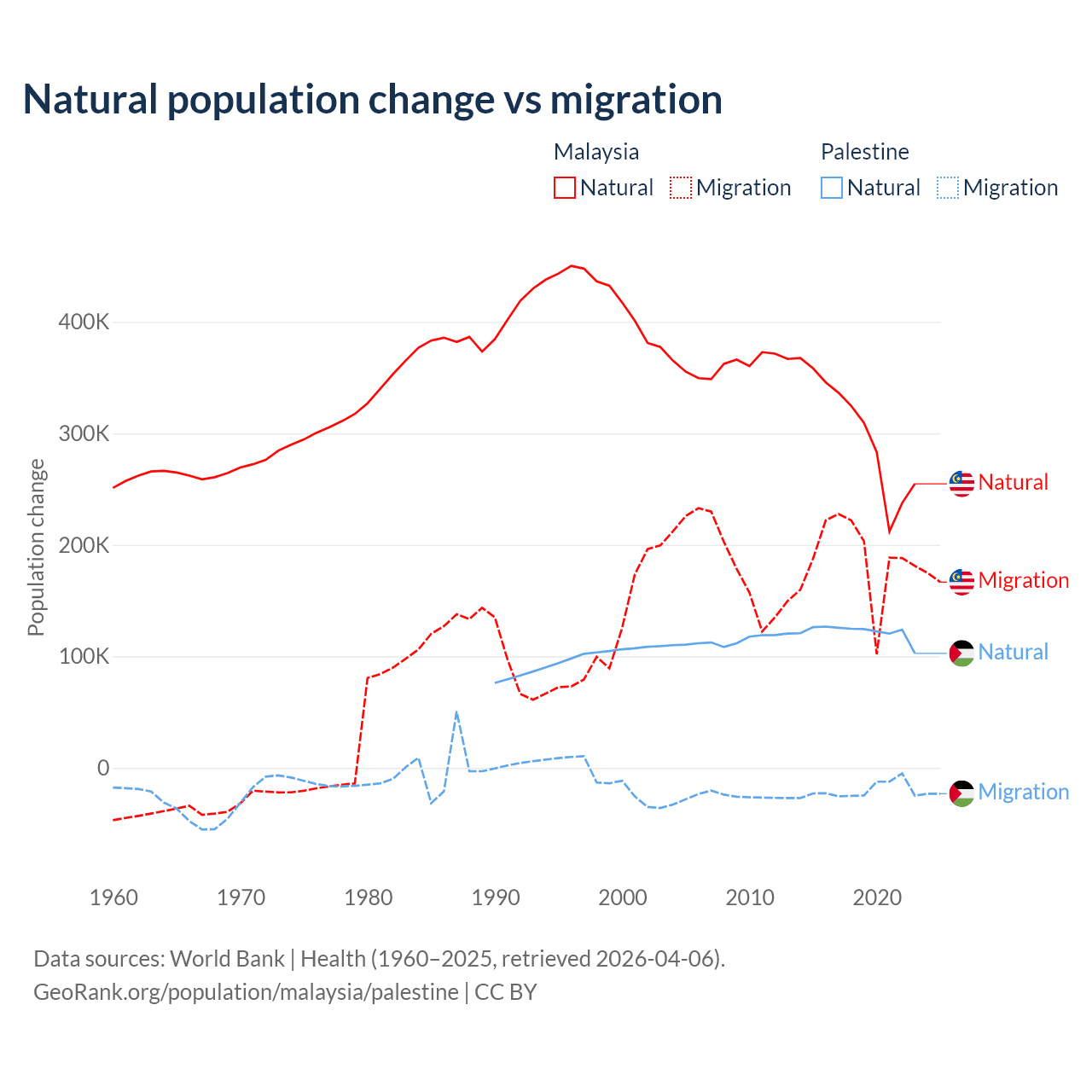 Over the last 10 years, 61.7% of the population change in Malaysia is from natural causes (a gain of 3,029,648 people) and 38.3% is from migration (a gain of 1,882,159 people). In Palestine 85.7% is from natural causes (a gain of 1,218,010 people) and 14.3% is from migration (a loss of 202,820 people).