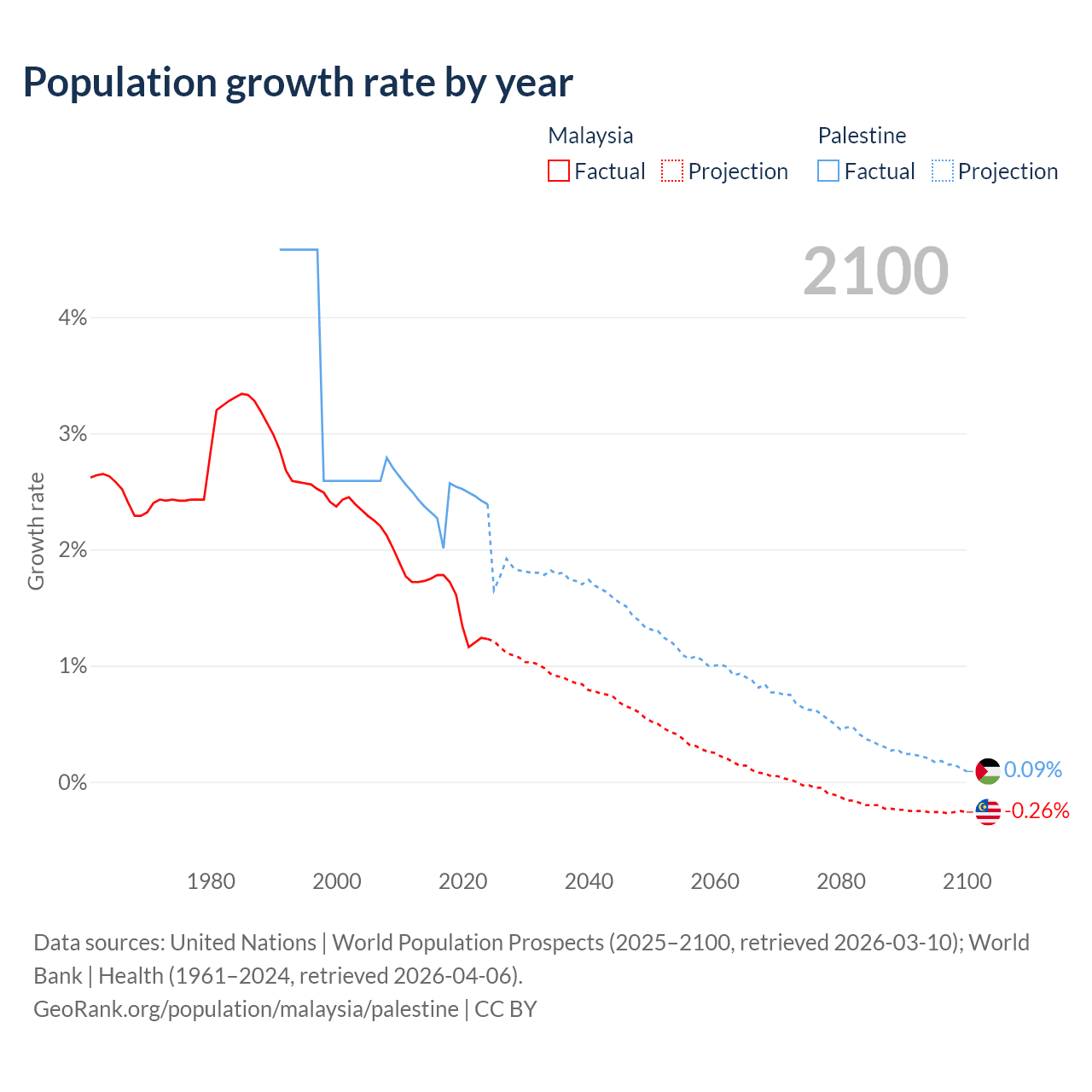 - For the last 10 years, Malaysia has had an average growth rate of +1.5% per year vs +2.4% in Palestine.