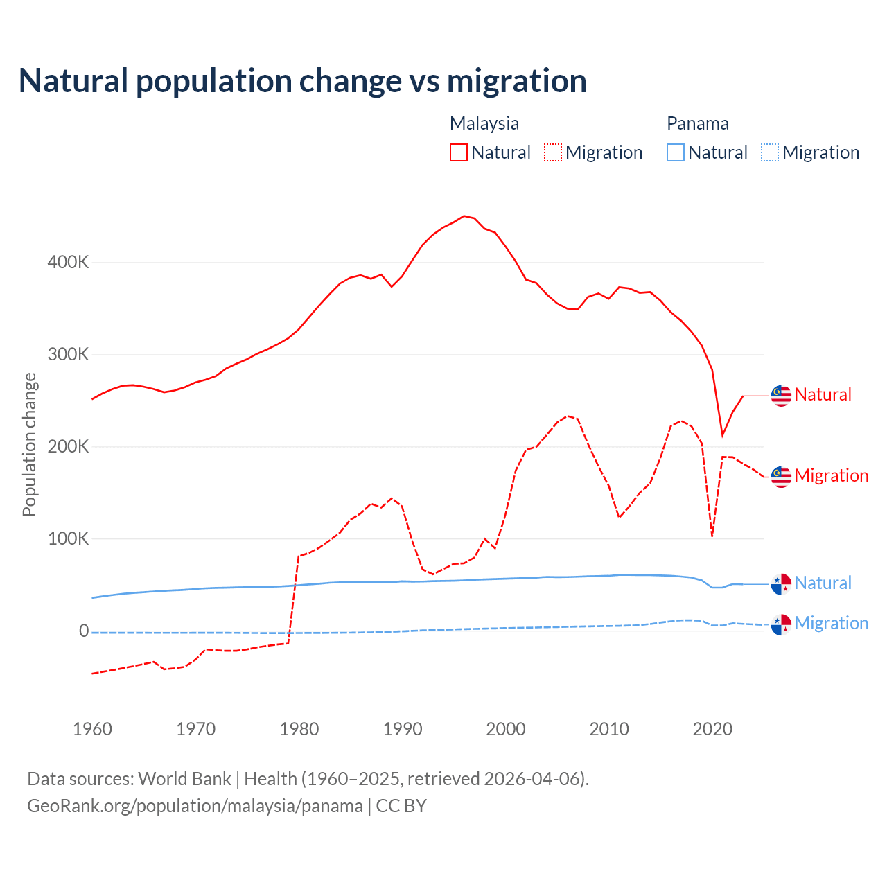 Over the last 10 years, 61.7% of the population change in Malaysia is from natural causes (a gain of 3,029,648 people) and 38.3% is from migration (a gain of 1,882,159 people). In Panama 86.5% is from natural causes (a gain of 544,211 people) and 13.5% is from migration (a gain of 84,849 people).