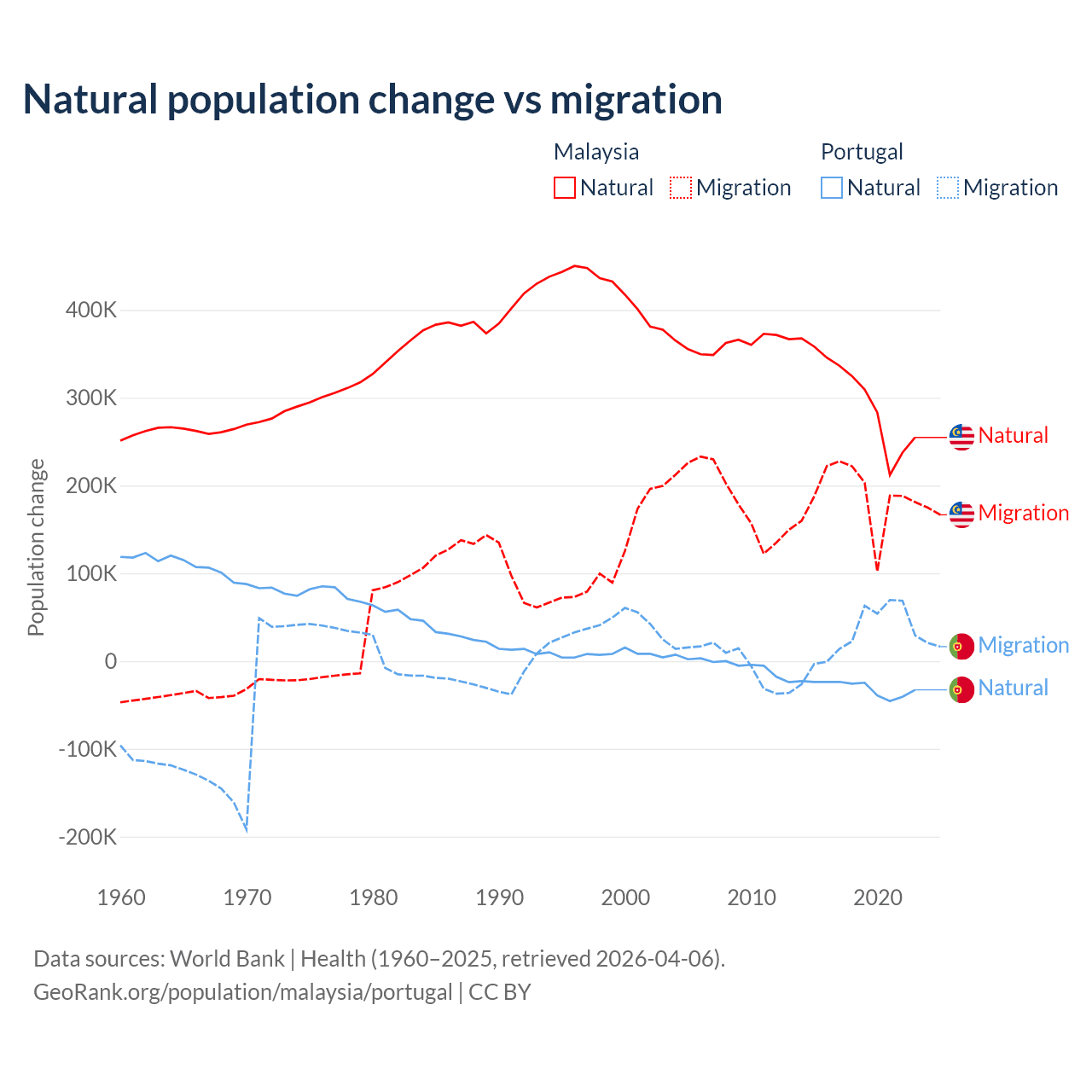 Over the last 10 years, 61.7% of the population change in Malaysia is from natural causes (a gain of 3,029,648 people) and 38.3% is from migration (a gain of 1,882,159 people). In Portugal 51% is from natural causes (a loss of 302,748 people) and 49% is from migration (a gain of 290,554 people).