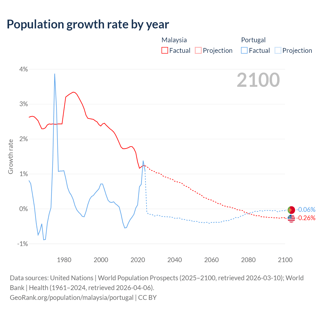 - For the last 10 years, Malaysia has had an average growth rate of +1.5% per year vs +0.21% in Portugal.