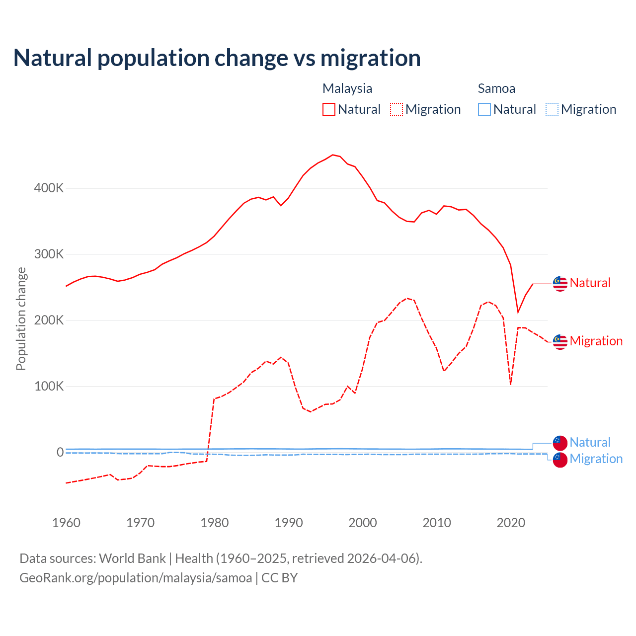 Over the last 10 years, 61.7% of the population change in Malaysia is from natural causes (a gain of 3,029,648 people) and 38.3% is from migration (a gain of 1,882,159 people). In Samoa 62.5% is from natural causes (a gain of 45,436 people) and 37.5% is from migration (a loss of 27,246 people).