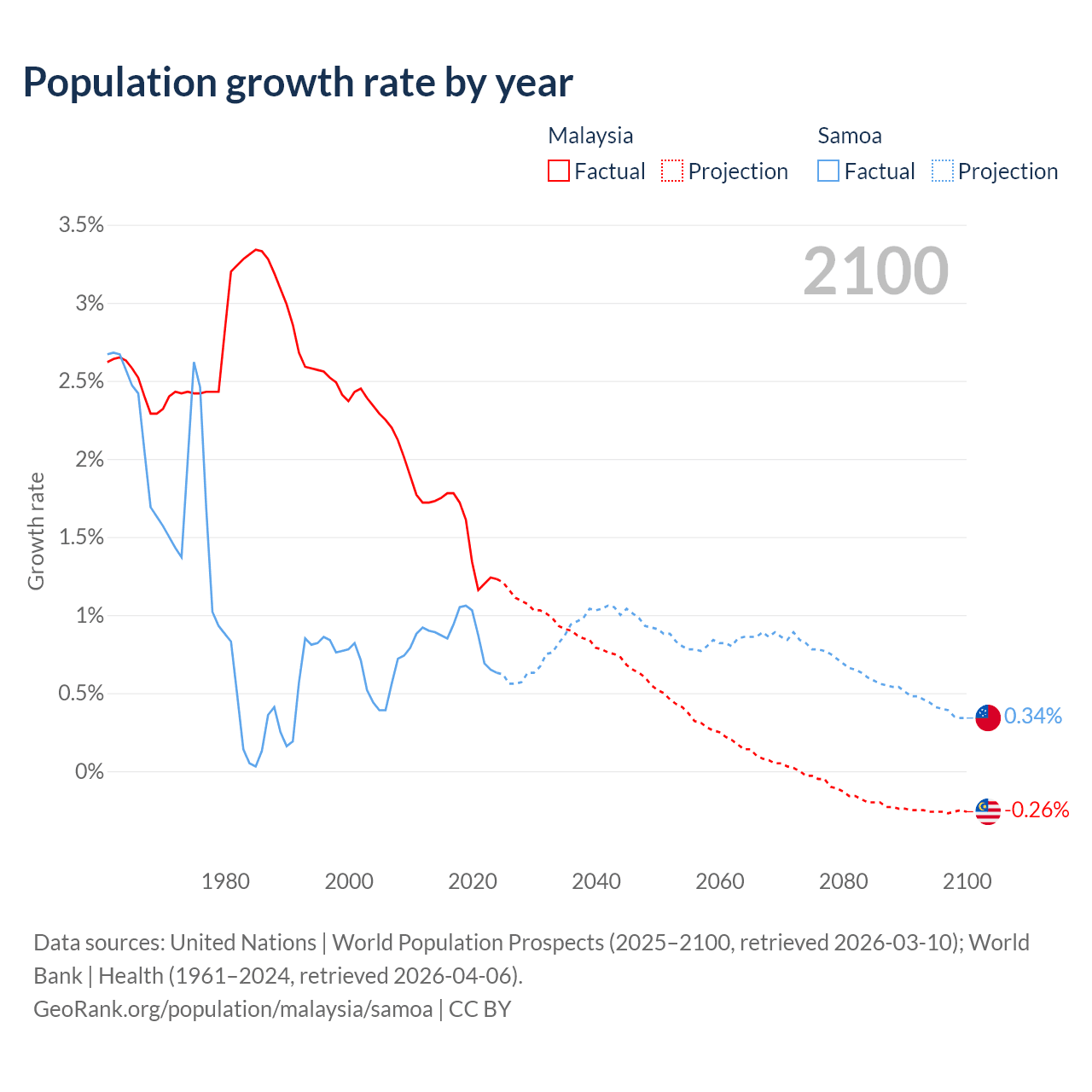 - For the last 10 years, Malaysia has had an average growth rate of +1.5% per year vs +0.87% in Samoa.