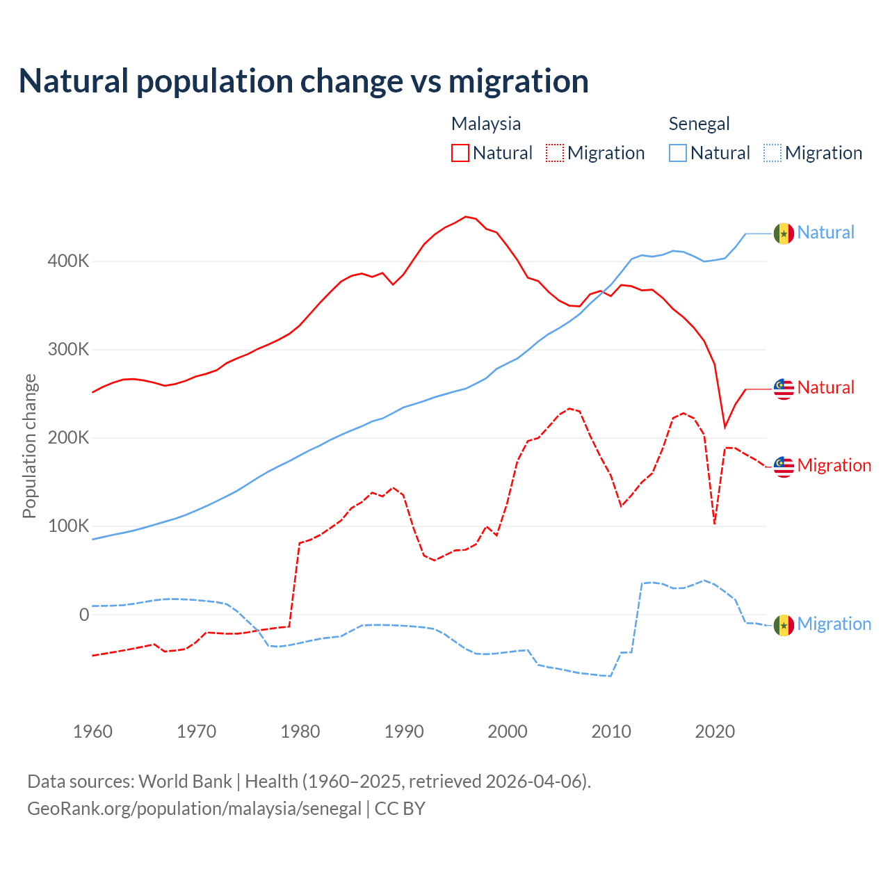 Over the last 10 years, 61.7% of the population change in Malaysia is from natural causes (a gain of 3,029,648 people) and 38.3% is from migration (a gain of 1,882,159 people). In Senegal 93.9% is from natural causes (a gain of 4,089,205 people) and 6.13% is from migration (a gain of 267,266 people).