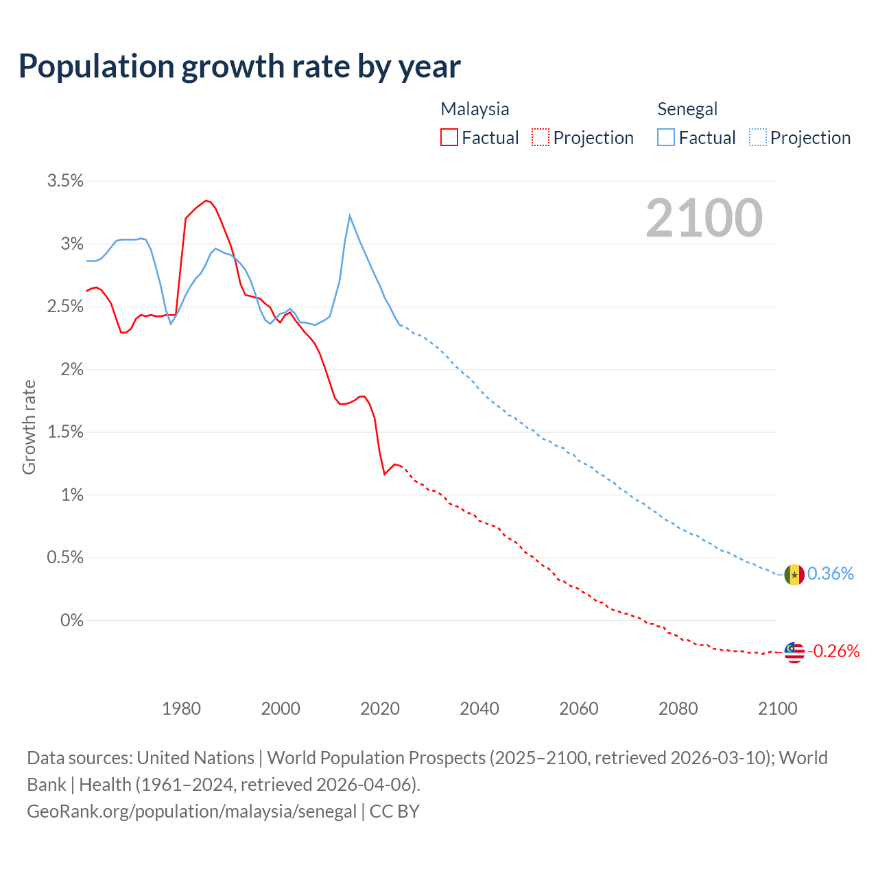 - For the last 10 years, Malaysia has had an average growth rate of +1.5% per year vs +2.76% in Senegal.
