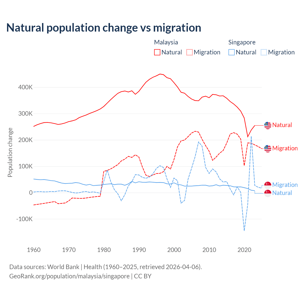 Over the last 10 years, 61.7% of the population change in Malaysia is from natural causes (a gain of 3,029,648 people) and 38.3% is from migration (a gain of 1,882,159 people). In Singapore 54.8% is from natural causes (a gain of 195,953 people) and 45.2% is from migration (a gain of 161,805 people).