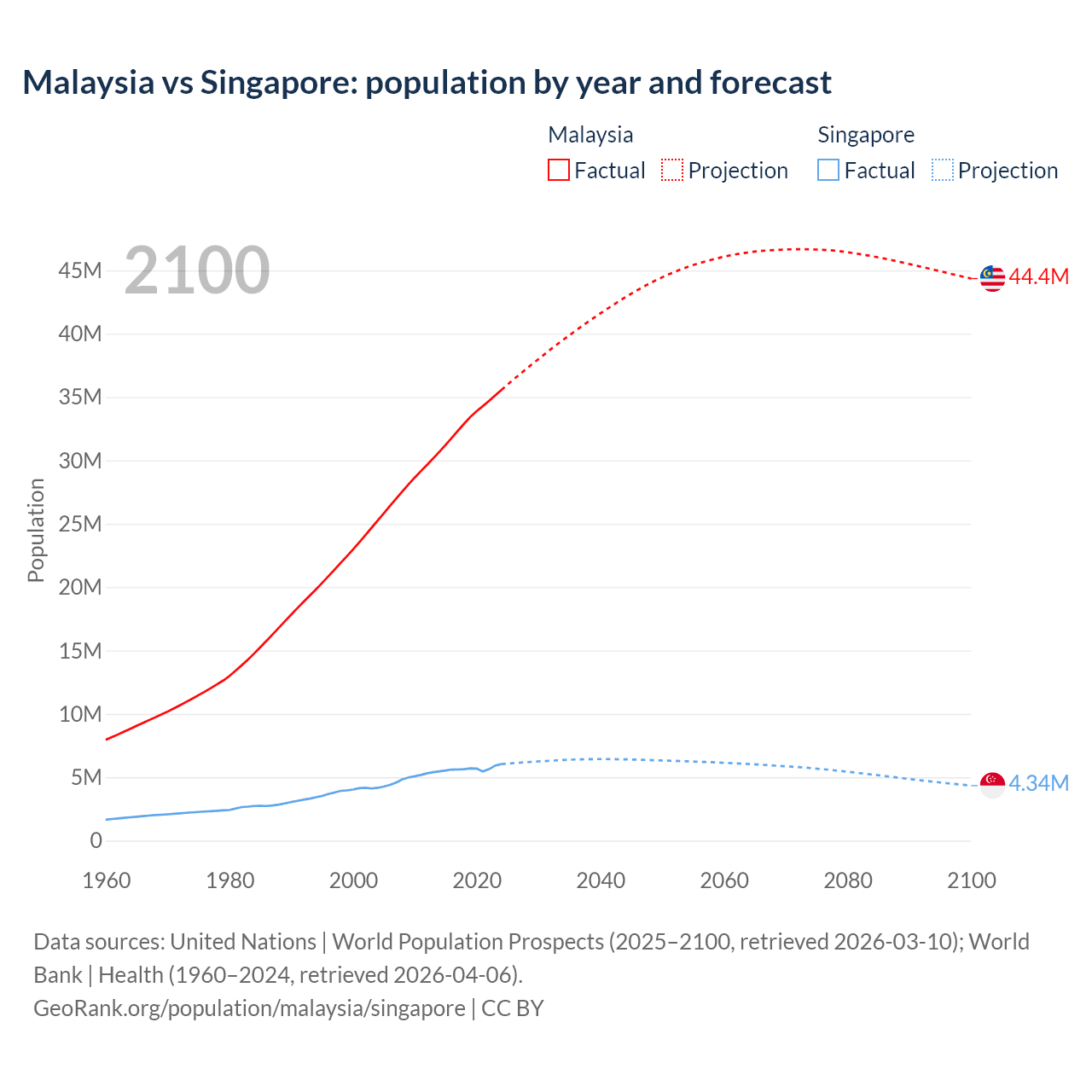 The latest officially reported population of Malaysia was 35,557,673 in 2024 vs 6,036,860 people in Singapore in 2024. In 2026, based on the adjusted UN estimation, the current Malaysia's population is 36,512,221 people compared to 6,125,852 in Singapore.