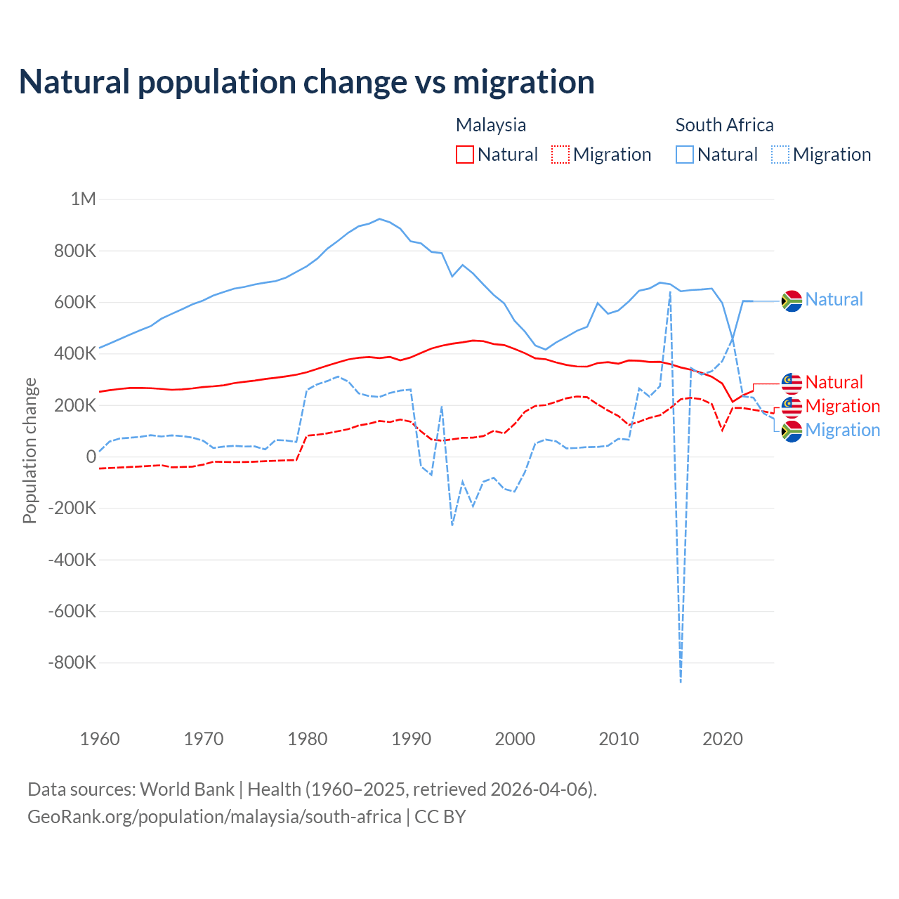 Over the last 10 years, 61.7% of the population change in Malaysia is from natural causes (a gain of 3,029,648 people) and 38.3% is from migration (a gain of 1,882,159 people). In South Africa 72.8% is from natural causes (a gain of 6,190,027 people) and 27.2% is from migration (a gain of 2,316,795 people).