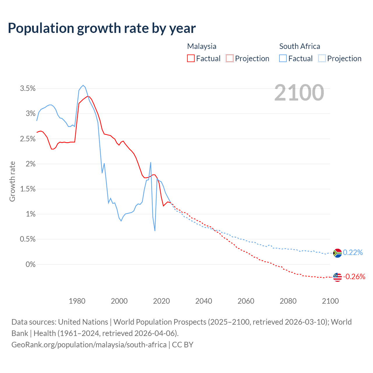 - For the last 10 years, Malaysia has had an average growth rate of +1.5% per year vs +1.44% in South Africa.