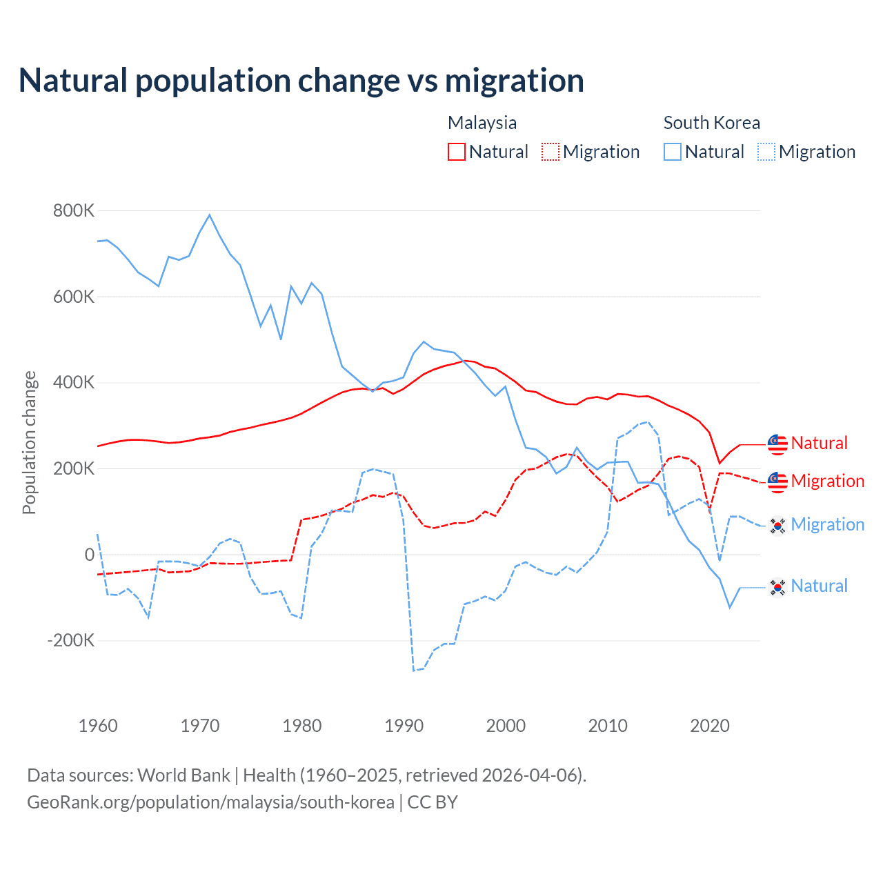 Over the last 10 years, 61.7% of the population change in Malaysia is from natural causes (a gain of 3,029,648 people) and 38.3% is from migration (a gain of 1,882,159 people). In South Korea 17.6% is from natural causes (a gain of 277,215 people) and 82.4% is from migration (a gain of 1,298,356 people).